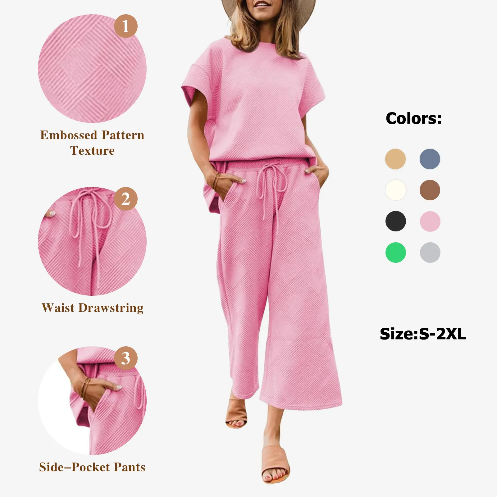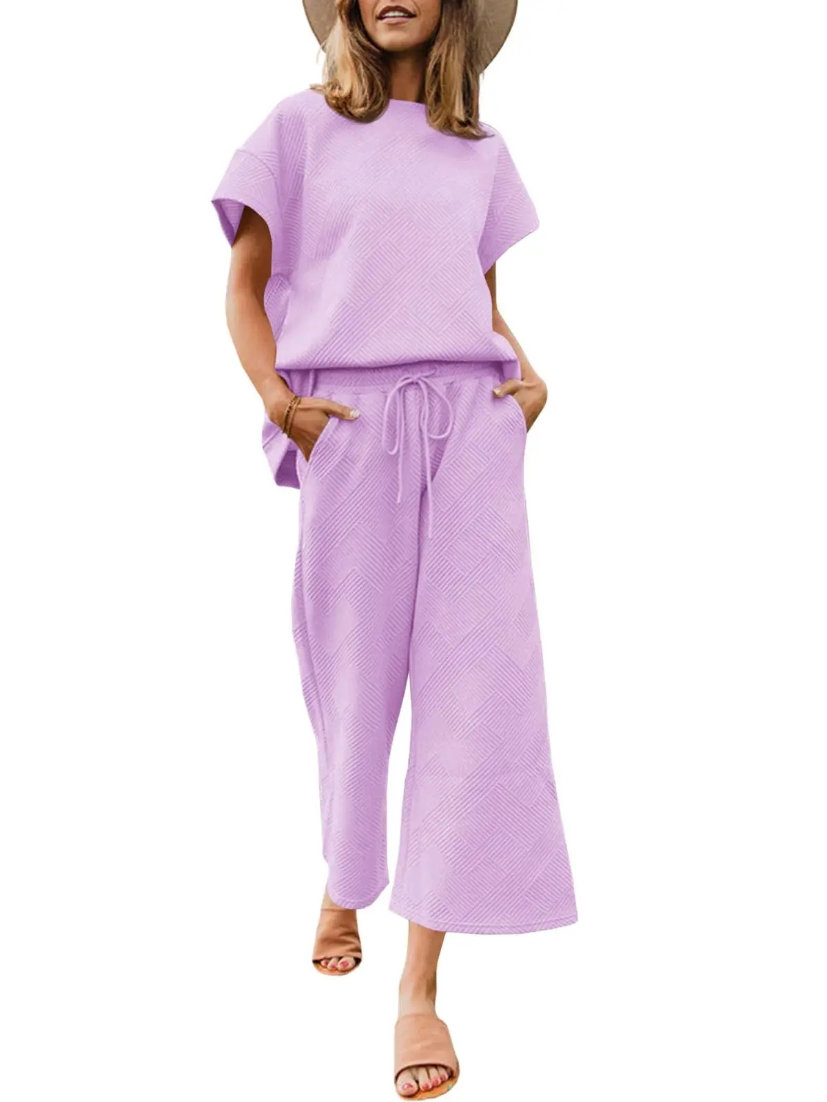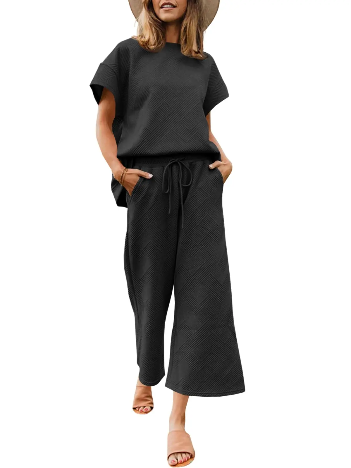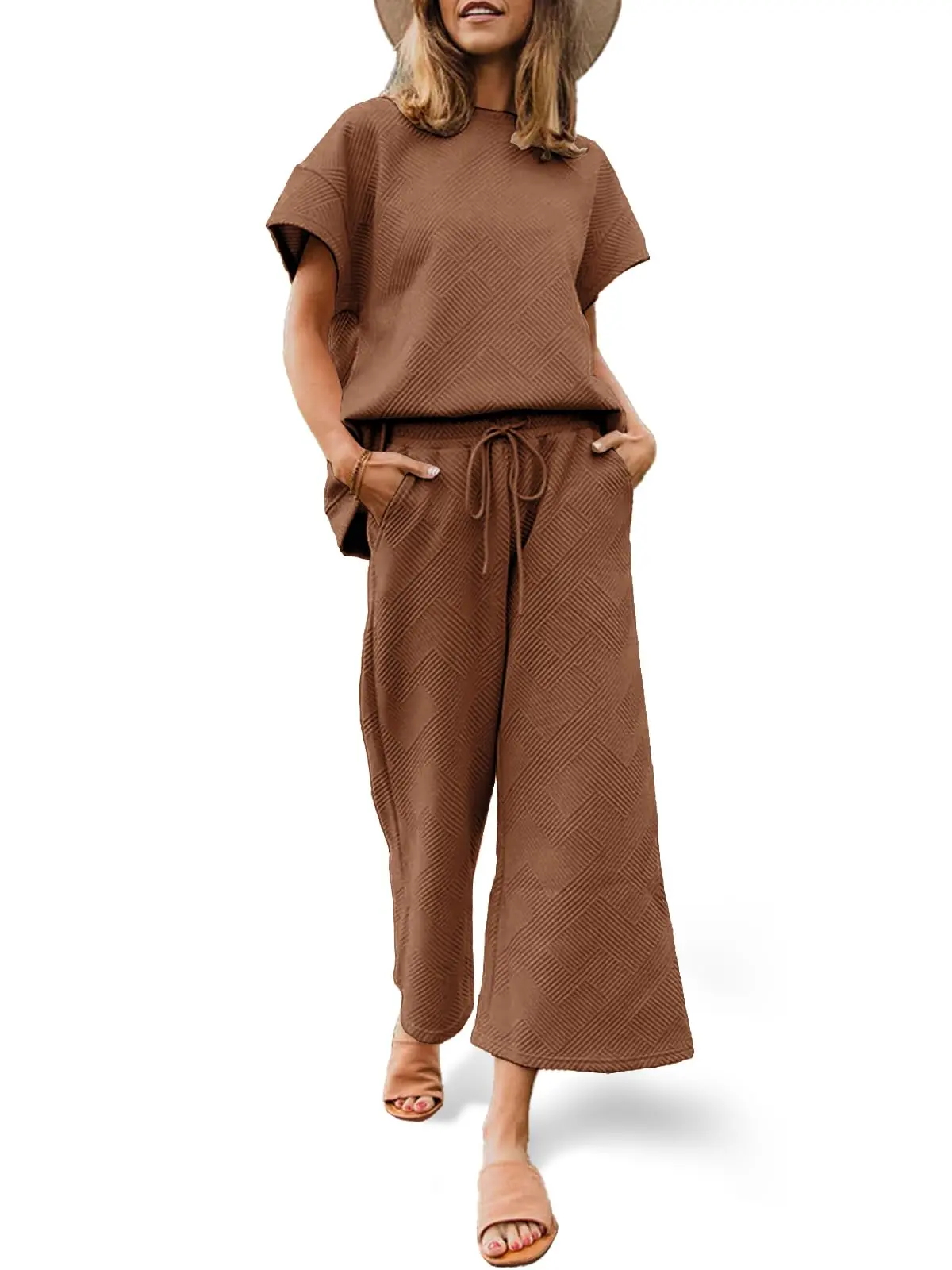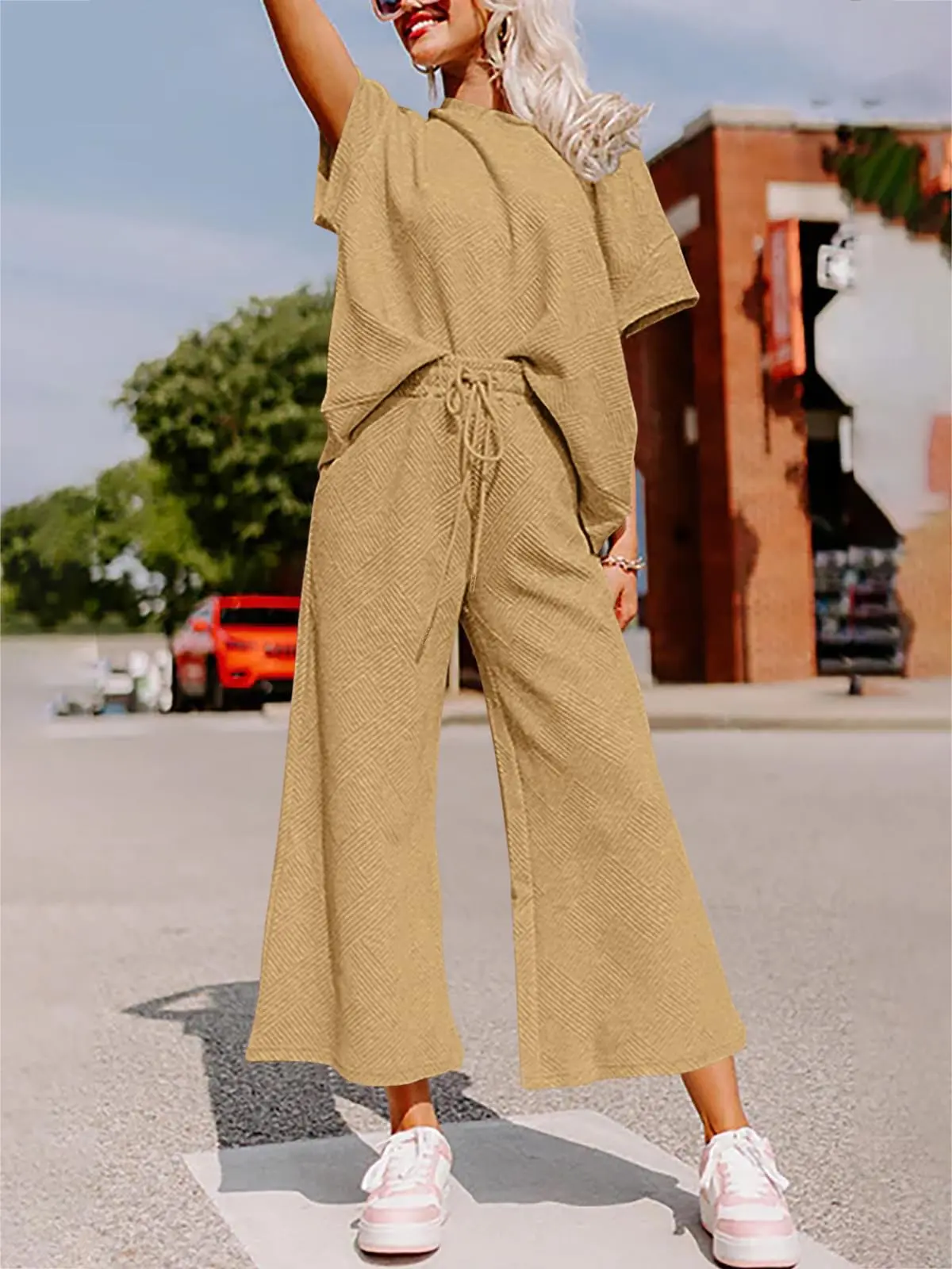 This two-piece set includes a round-neck, short-sleeve T-shirt and drawstring waist wide-leg pants with pockets. The loose fit offers a trendy and cozy look. Ideal for any time of the day, it combines style with practicality.