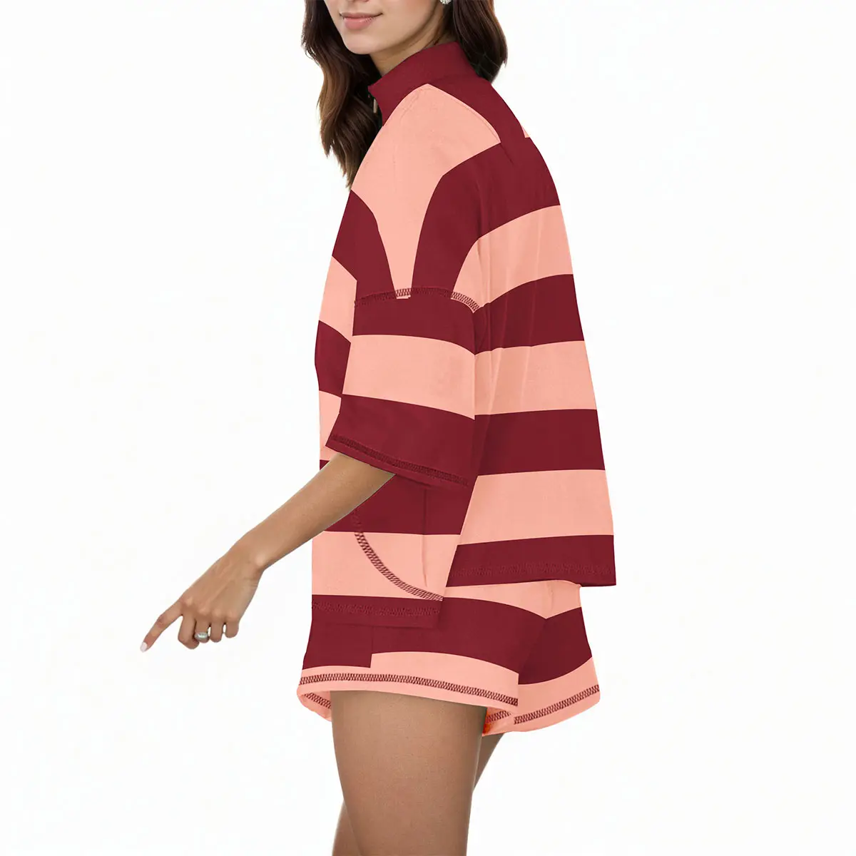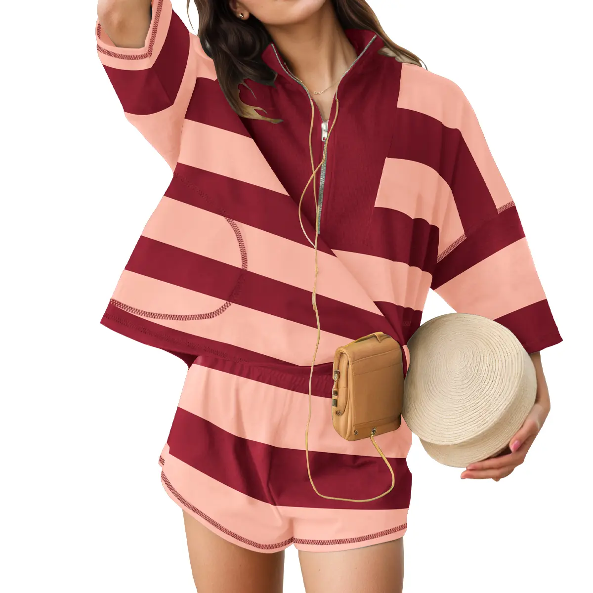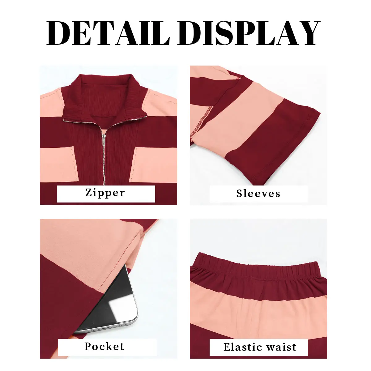 ·Bold, Sporty Design: Featuring a wide stripe pattern for a vibrant and athletic look. The top includes a stylish half-zip front, drop shoulders for ease of movement, and side pockets for small essentials.