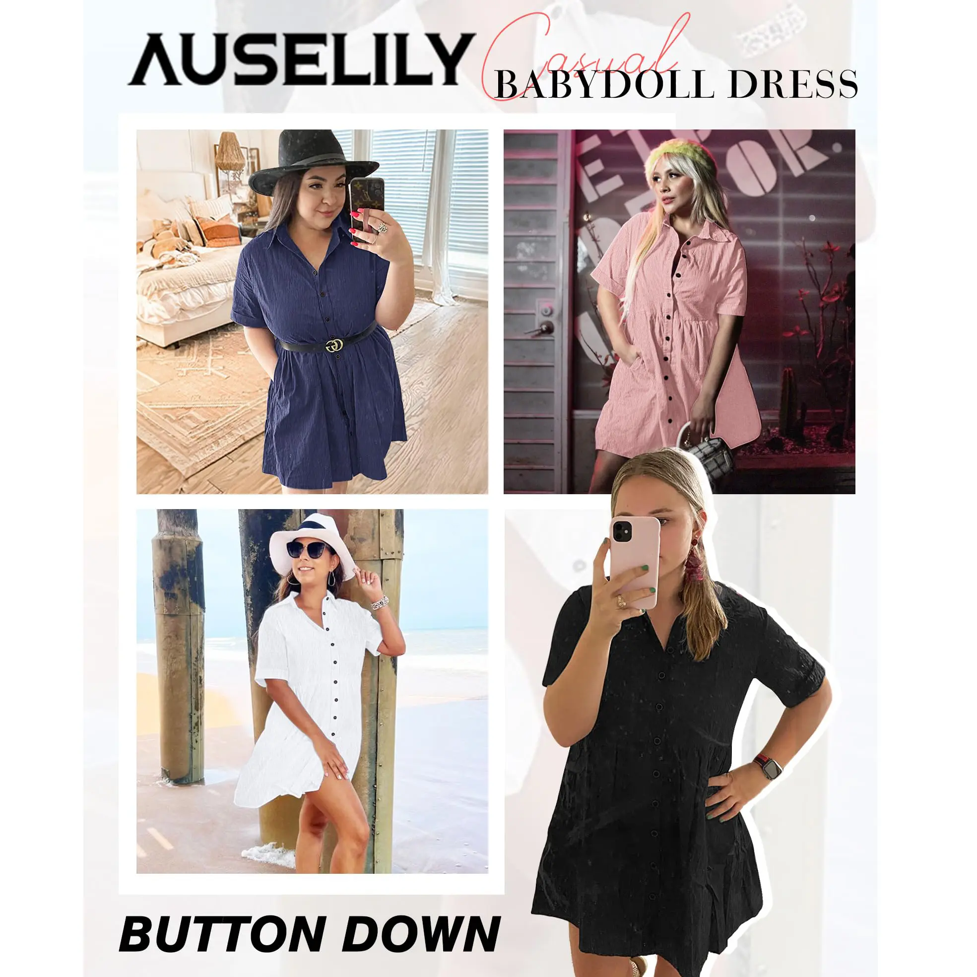 Auselily Babydoll Dress for Women Short Sleeve Button Down Mini Tunic Dress with Pockets