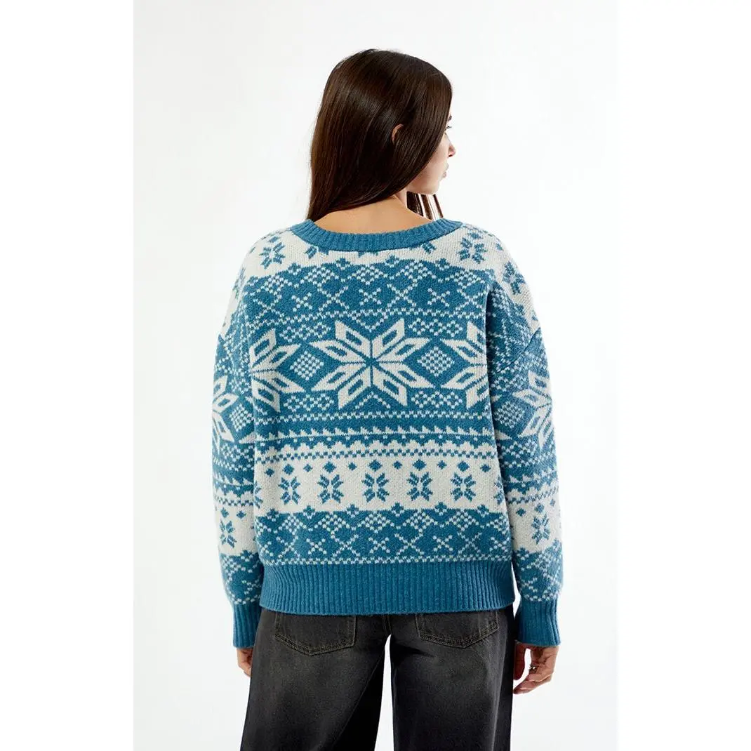 The Astrid Fair Isle Sweater from Your Favorite brings playful, cozy charm to a classic winter print. Featuring long dropped-shoulder sleeves, a crew neckline, ribbed trimming, and a slightly oversized fit, this sweater combines warmth with relaxed, effortless style.