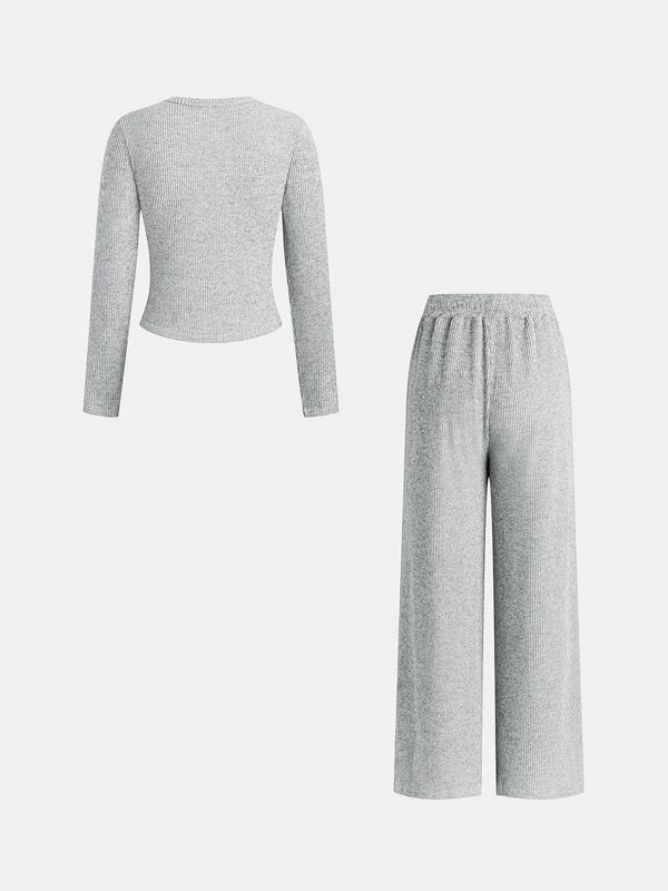 Women's Autumn Winter 2-Piece Set, Casual Round Neck Knitted Cardigan with Buttons & Loose-Fit Pants