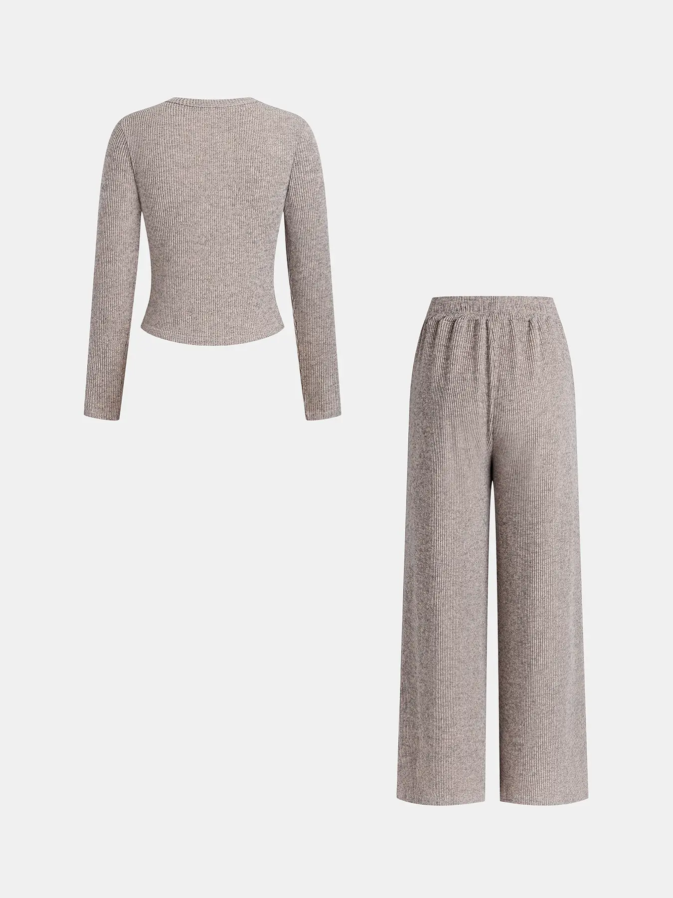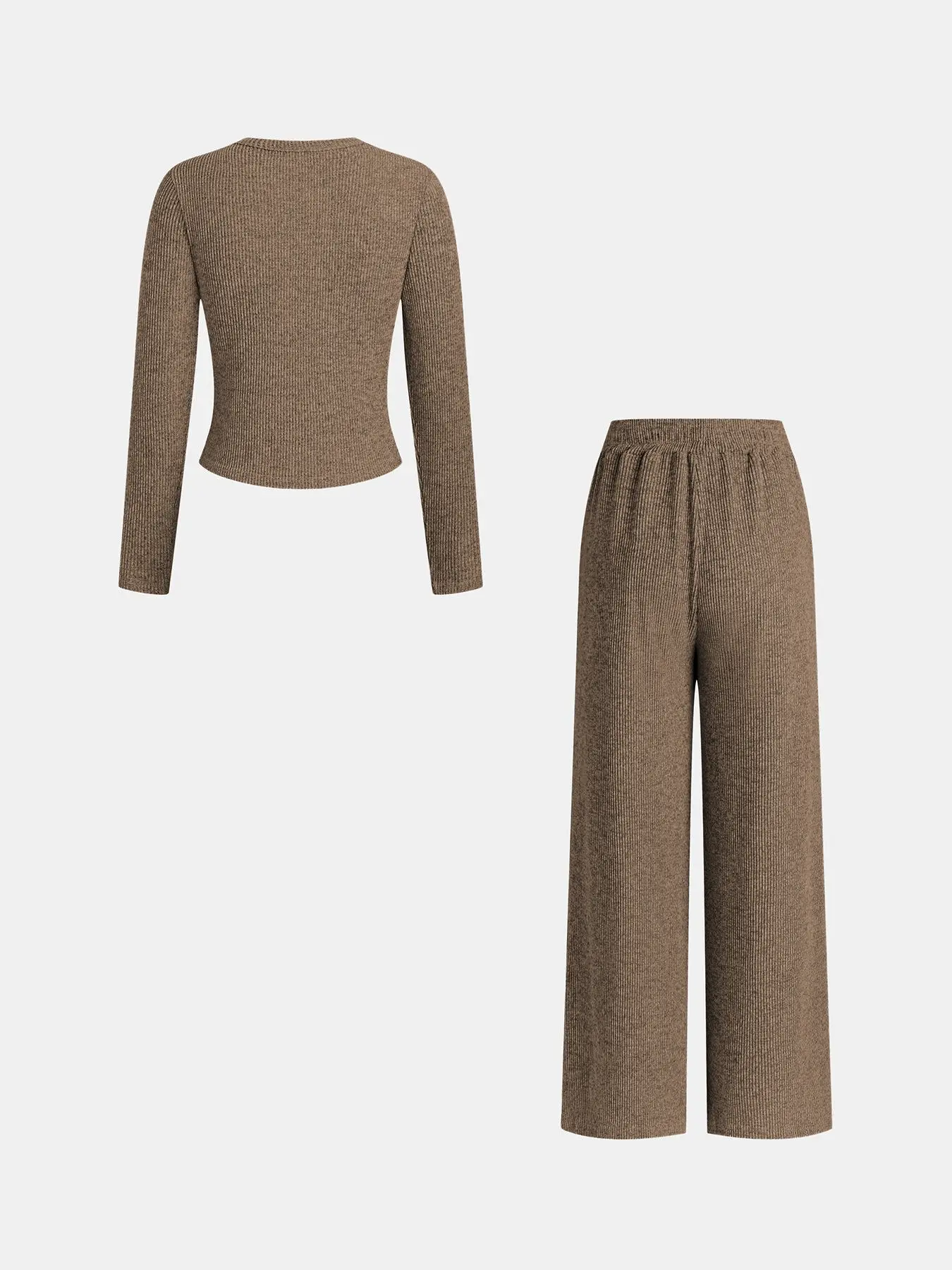 5. Women's Autumn Winter 2-Piece Set, Casual Aesthetic Round Neck Knitted Cardigan with Buttons & Loose-Fit Pants