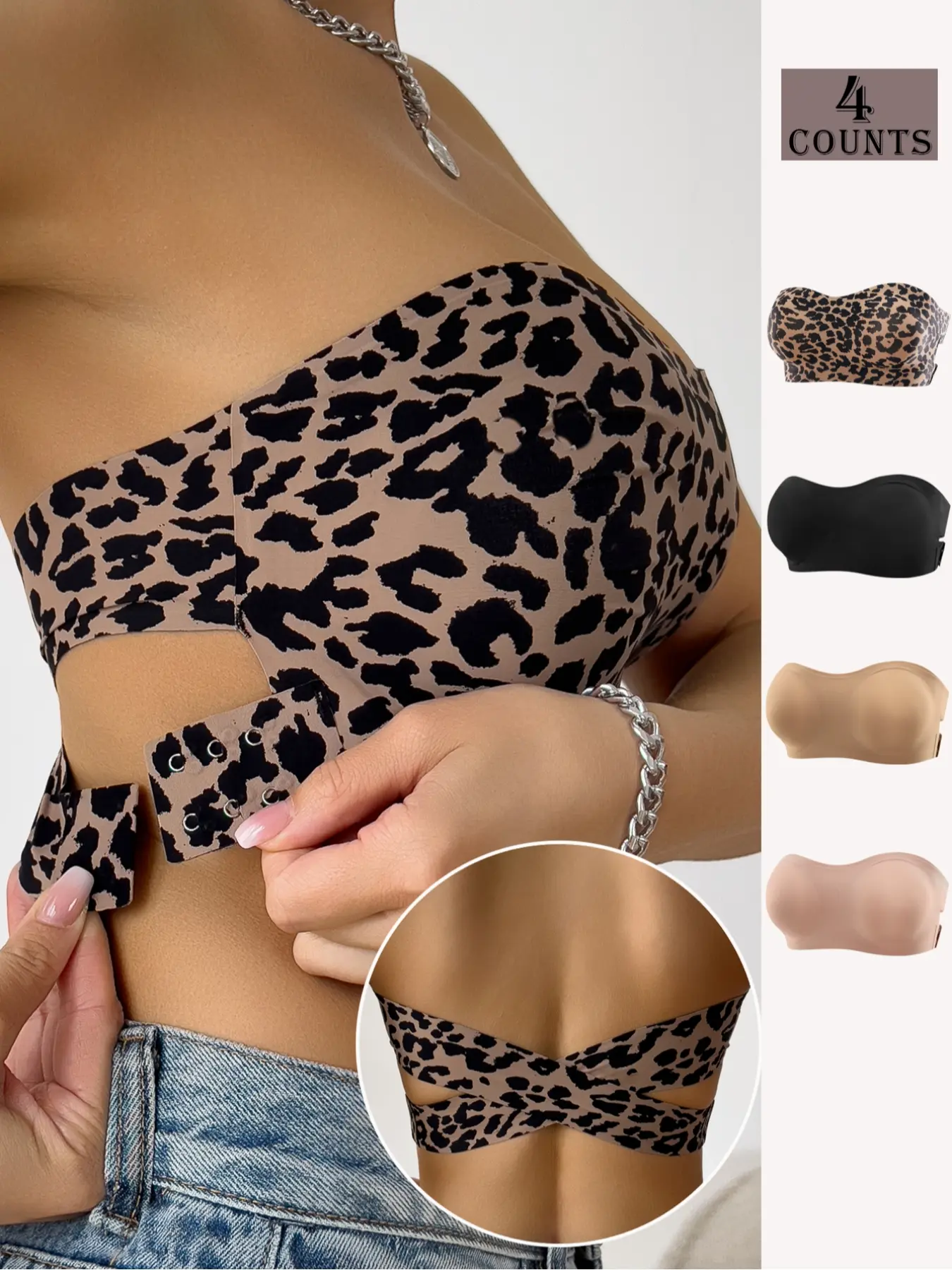 Conjunto de bralette sin espalda para mujer, estampado de leopardo y colores lisos, tirantes ajustables y diseĂąo de hebillas cruzadas. #bralettes #mujer #chicas #tiktokshop
