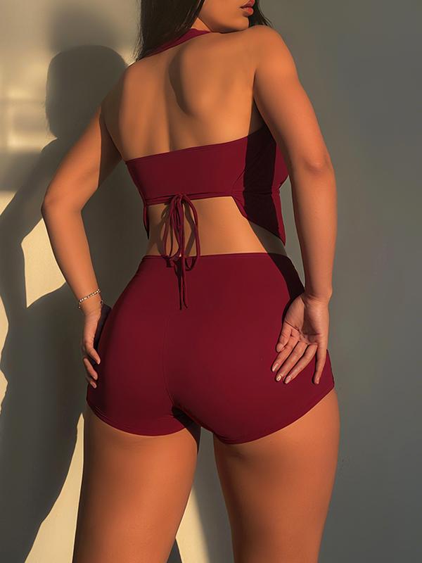 Women's Solid Backless Halter Neck Romper & Crop Bra, Fashion Casual Romper & Top Set for Daily Outdoor Wear, Women Clothes for Summer, Womenswear