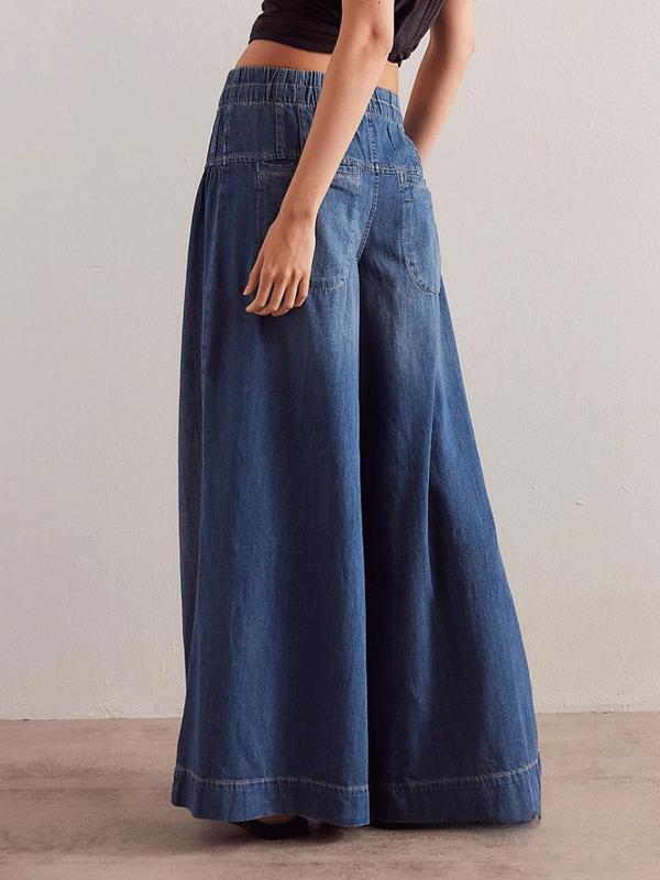 ·[Design] This baggy jeans' closure combined drawstrings and buttons, easy to put on and take off, extra wide legs are great for hiding the flesh on your legs and bending them, trendy front pleated design, flare leg denim pants, 2 rear pockets, solid color- dark blue, light blue, ruffle pleated jeans pants