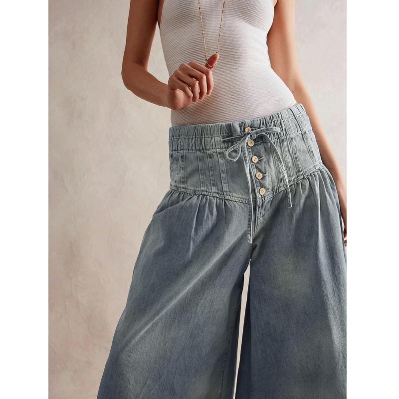 ·[Dressy Elastic Midi Rose Jeans] Baggy jeans for women dressy casual mid waisted denim pants/Ruffle pleated wide leg long pants with pockets/Flare leg denim pants for women/plus size pants for women/Casual loose drawstring trousers/Black jeans