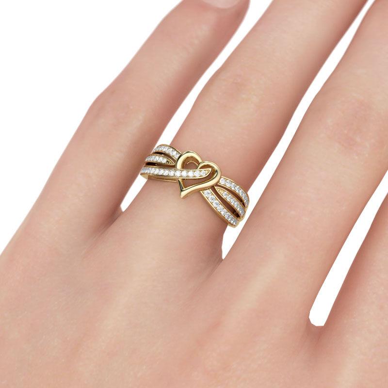 This statement of romance will make her day and illuminate her finger. Designed in yellow golden color, a lovely open heart shines at the center of the band, while rows of round stones glisten on the open shank. This band makes a stunning statement of everlasting love.