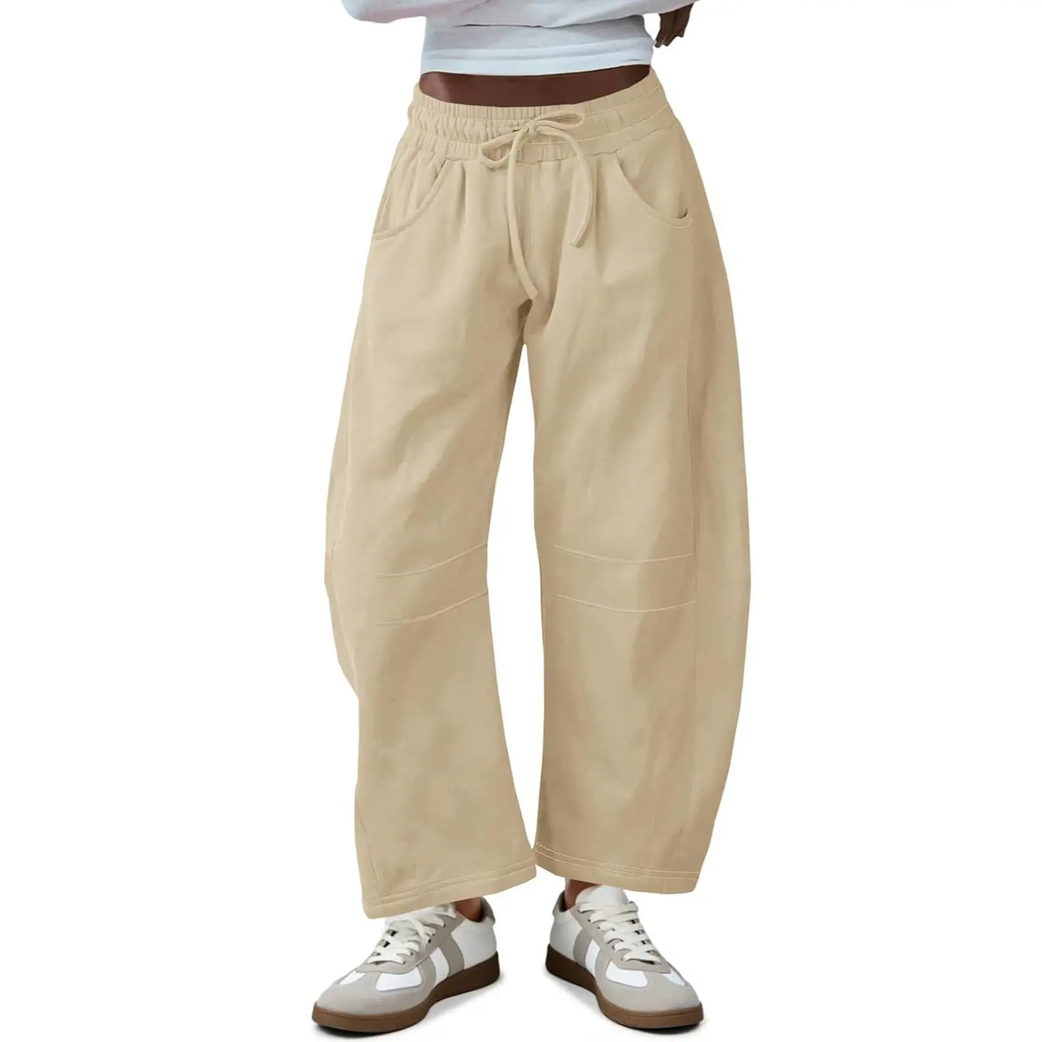 ·PANTS FEATURES: Featuring a comfortable drawstring and elasticated waist for a flexible, adjustable fit. The unique barrel leg silhouette creates a relaxed yet stylish wide-leg shape, tapering slightly towards the ankle. Designed with practical pockets, carry your essentials