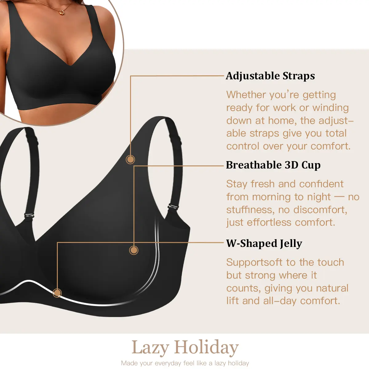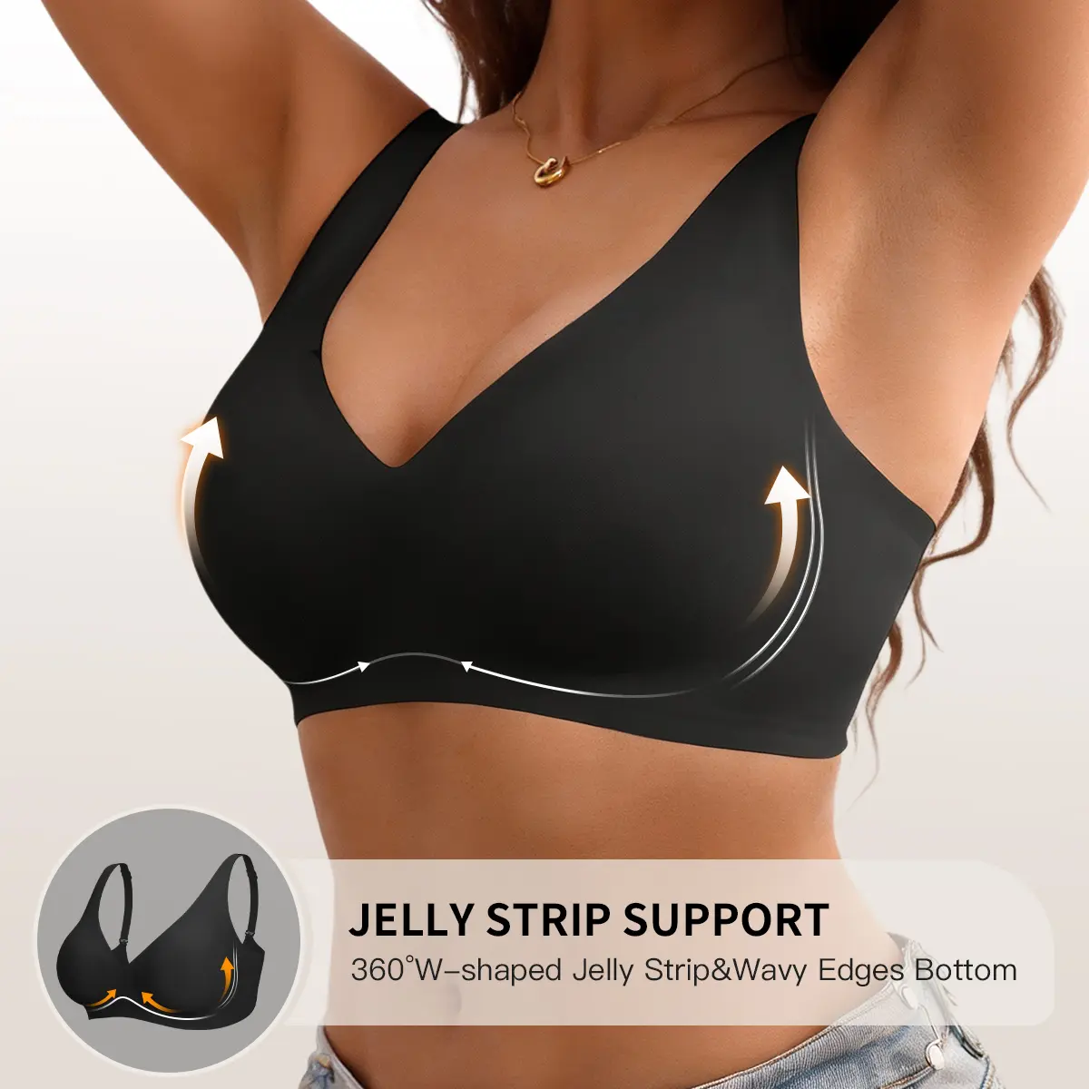 Features "W" shaped jelly gel for 360° soft lift and anti-sagging support. 3D molded cups enhance your natural shape without stiffness or poking. This bra provides full support without compromising comfort.
