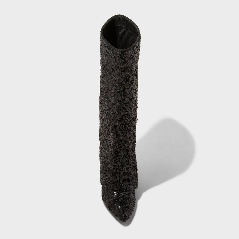 These Abba Sequin Foldover Tall Boots from A New Day are all about making a big statement on the dance floor and beyond. These black boots are covered in black sequins and designed with a pointed closed toe and a 15-inch knee-high silhouette. Set on a 3.25-inch stiletto heel, the foldover boots feature a side zipper fastening for a secure, snug fit. Pair them with shorts, a mini skirt or a midi dress for a standout look.