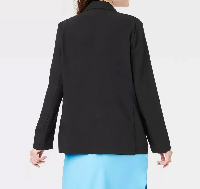 This Essential Blazer from A New Day makes a versatile addition to your off-duty or on-duty wardrobe. Made of a breathable fabric blend with partial lining, this long-sleeve blazer is rendered in a solid black shade that allows you to dress your ensemble up or down with just one piece. The single-breasted blazer with a notched collar and front button-down placket lends an elegant look, while the casual-fit silhouette with below-the-hip length and back vents allows for easy layering over your dresses.