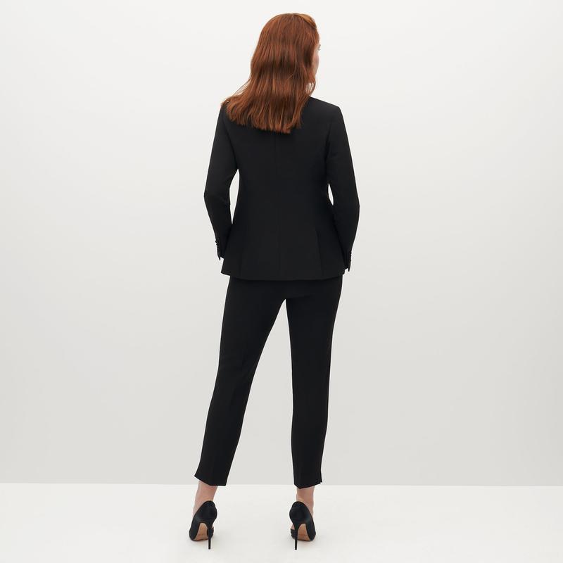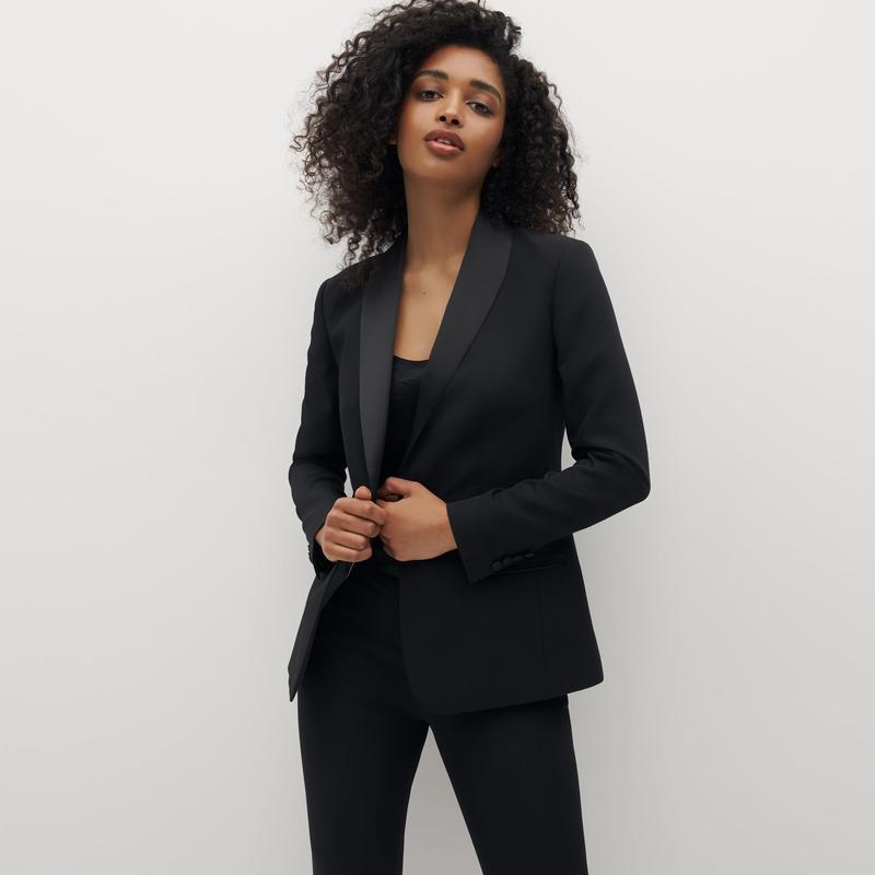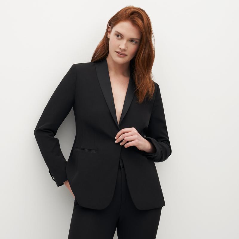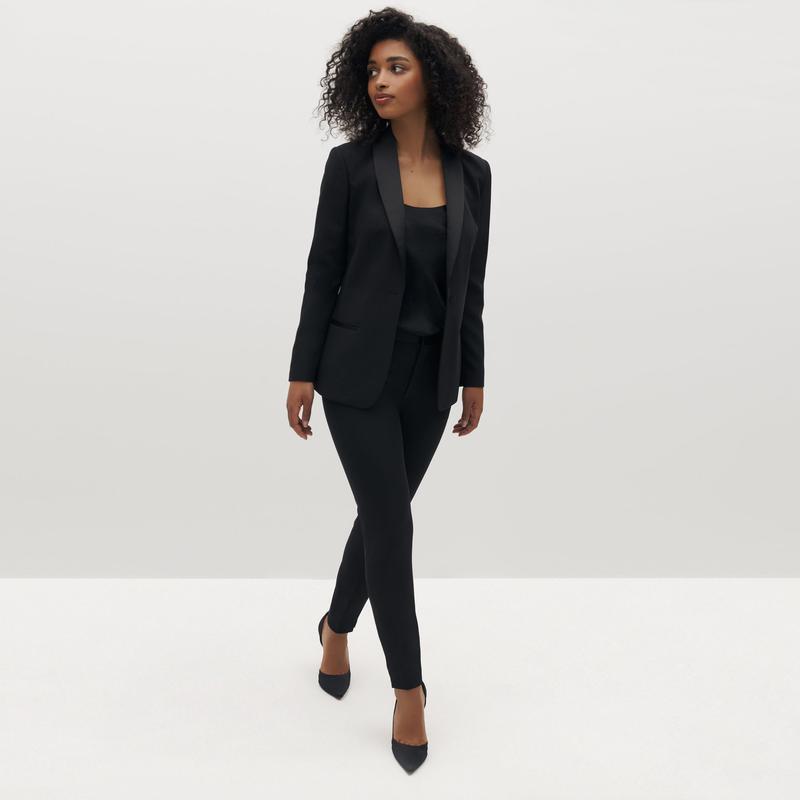 The new little black dress: enter, the Women’s Black Tuxedo Jacket. This dress alternative does even more, from formal functions to trendy outfits, wedding wear, professional looks, and back, making this black tuxedo blazer women’s wardrobe hero. Classic tailoring, upgraded, makes this the perfect women’s tux, with a shawl lapel, a single-button front to elongate your figure, and satin accents. This women’s black tuxedo blazer is your next fashion favorite.
