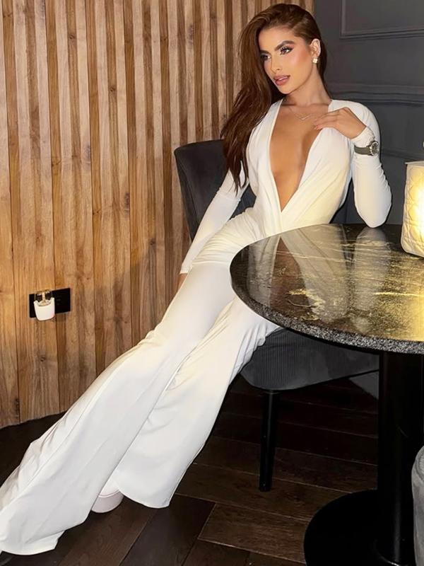 Women Spring Autumn Long Sleeve V Neck Bodycon Jumpsuit Overall One Piece Outfit