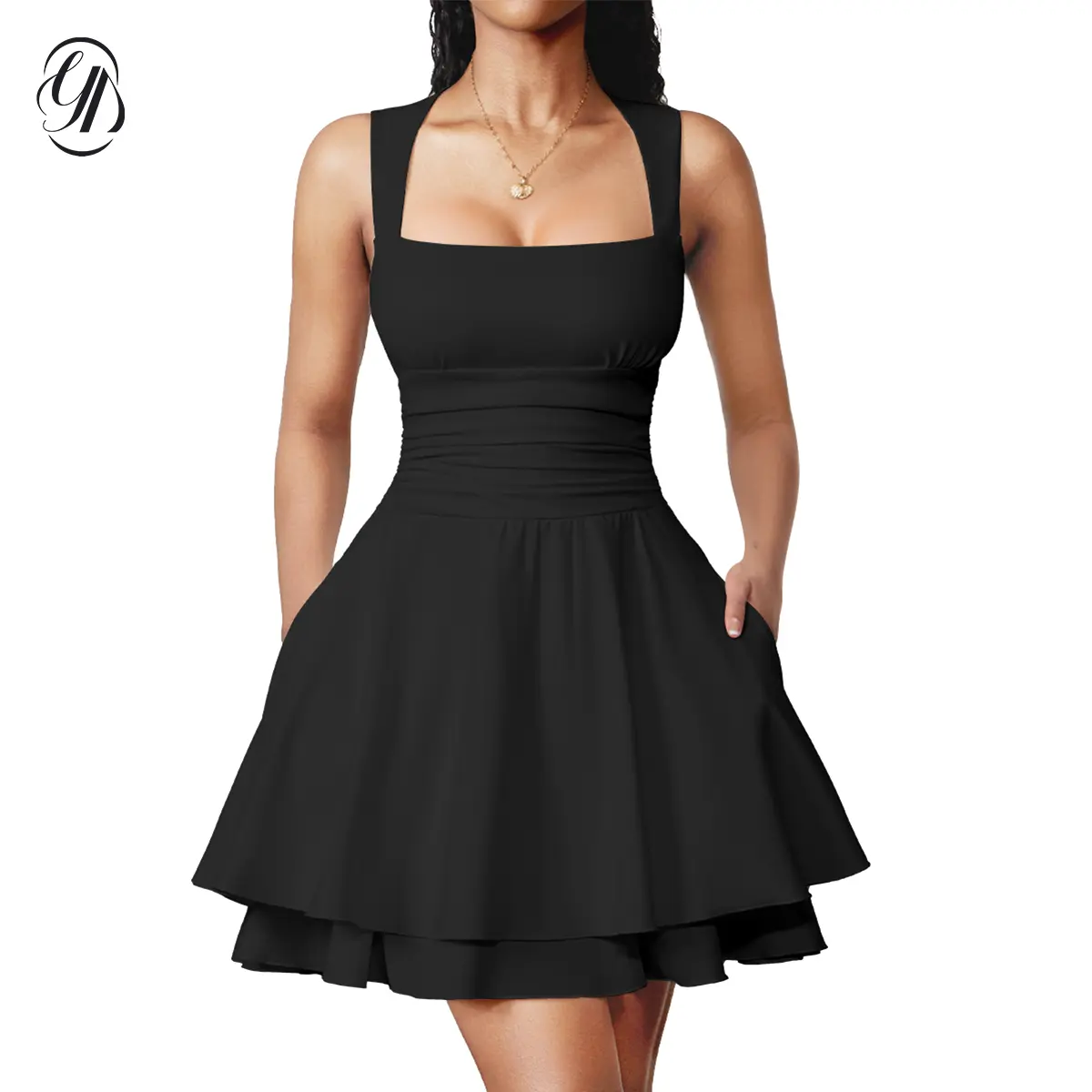 Feature: Elegant Square Neckline: The chic square neckline offers a flattering and modern look, perfect for showcasing your collarbones. Ruched Waist Detail: The ruched waist adds texture and shapes your figure, creating a flattering hourglass effect that enhances your natural curves. A-Line Skirt with Double Ruffle Hem: The A-line shape offers a playful,feminine vibe, while the double ruffle hem adds a stylish and fun twist, giving the dress extra movement and charm.
