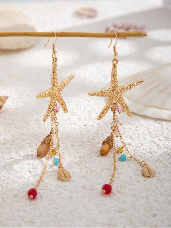 5. Women's Boho Style Alloy Statement Earrings Set, Ocean-Inspired Starfish Shell Design, Irregular Crystal Beaded Dangle Jewelry for Daily Wear & Vacation