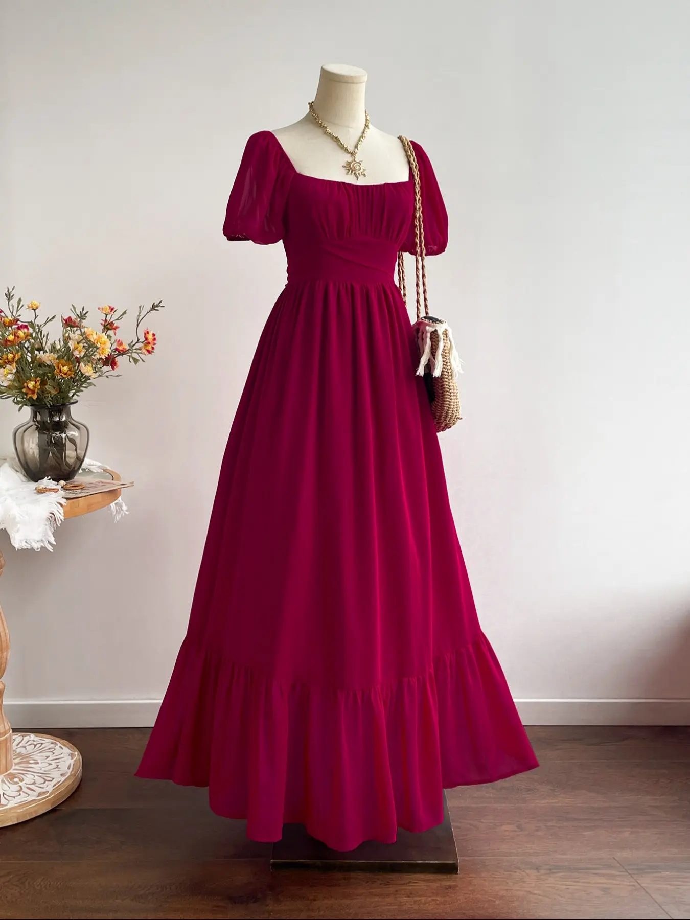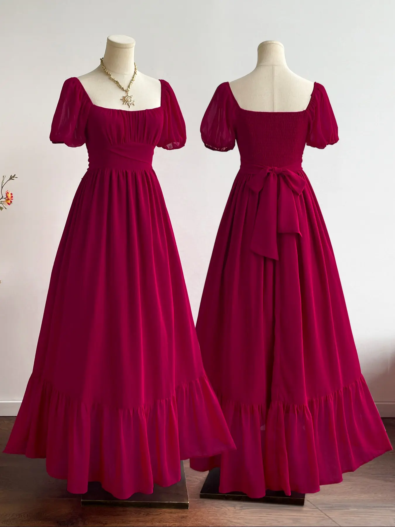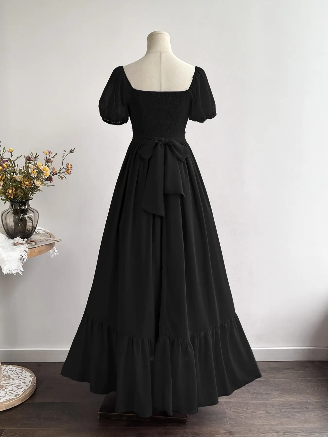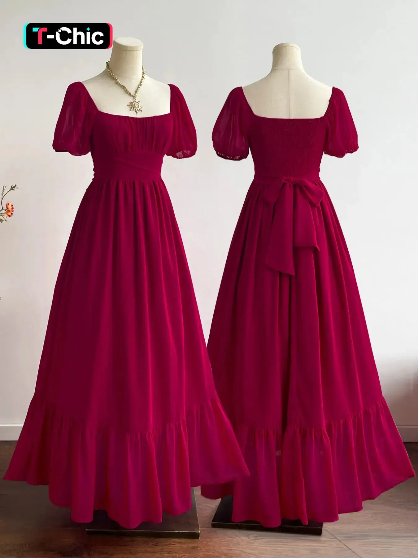 Women's Bohemian Vacation Elegant Chic Casual Waist-Tied Chiffon Woven Floral Long Short Sleeve Ruffle Hem Dress, All Seasons Fitted Style