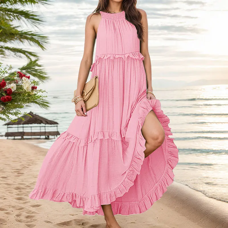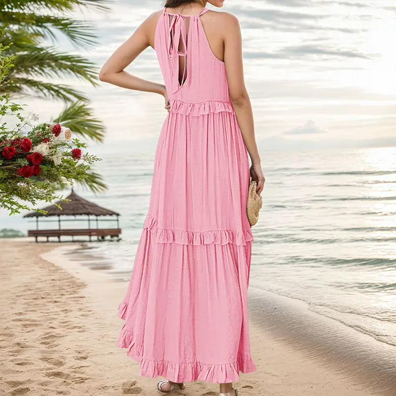 Designed for both comfort and charm, this Women’s Halter Neck Maxi Dress is your go-to piece for summer elegance. The halter neck and sleeveless cut keep things cool and breezy, while the elastic high waist offers a flattering fit that hugs in all the right places. The tiered ruffle hem creates movement and adds a romantic, feminine flair.
