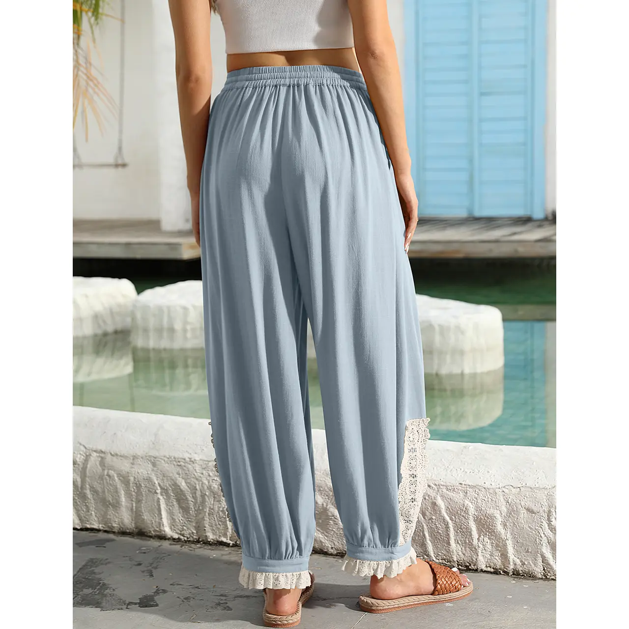 Crafted from a lightweight 30% linen, 70% rayon fabric that’s soft, breathable, and cooling. Features a wide-leg, loose fit with a stretchy waistband and adjustable drawstring—great for summer, the beach, yoga, or relaxing.