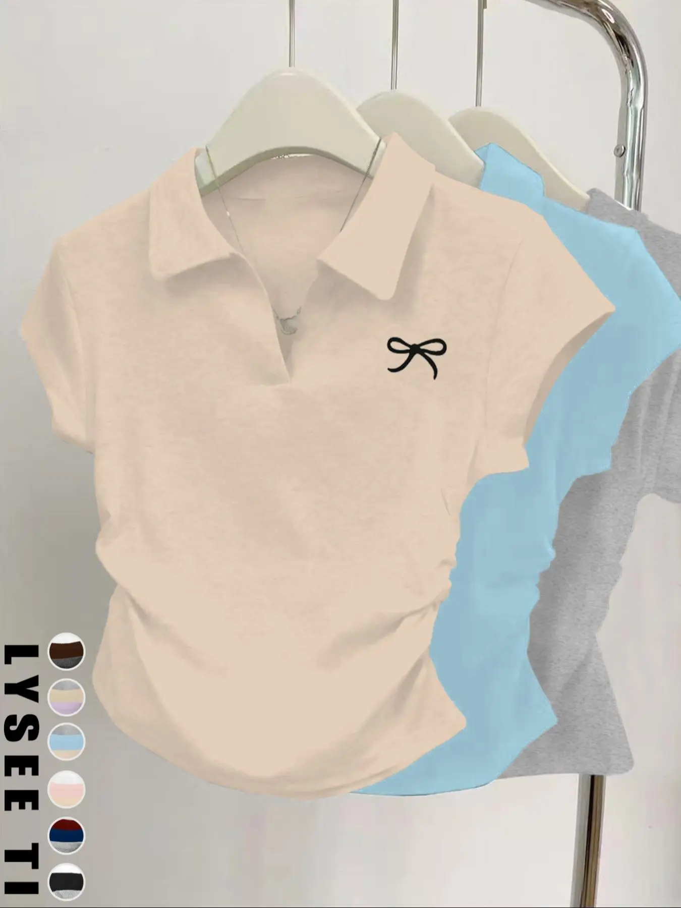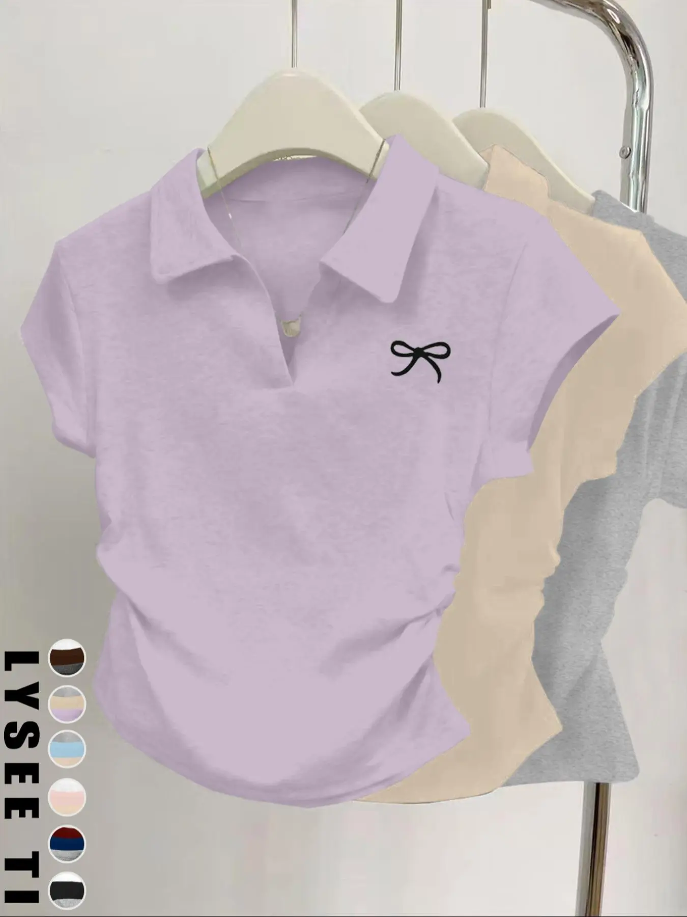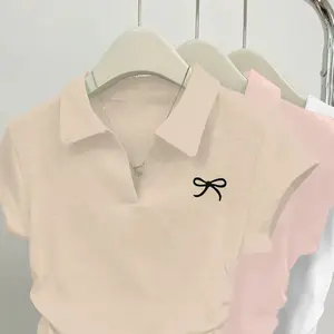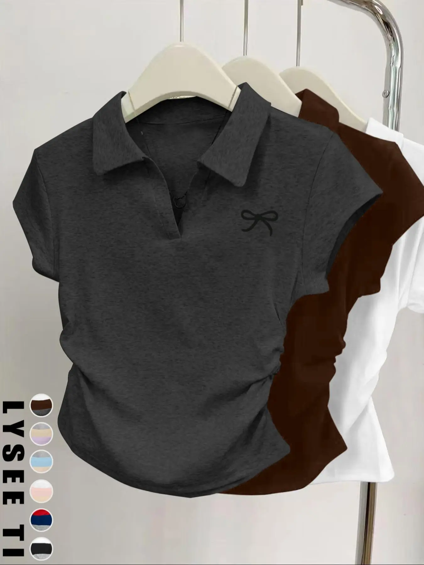 Preciosas camisetas estampadas de lazo y con cuello, mangas cortas, entalladas y fruncidas a los laterales, muy confortables para toda ocasión