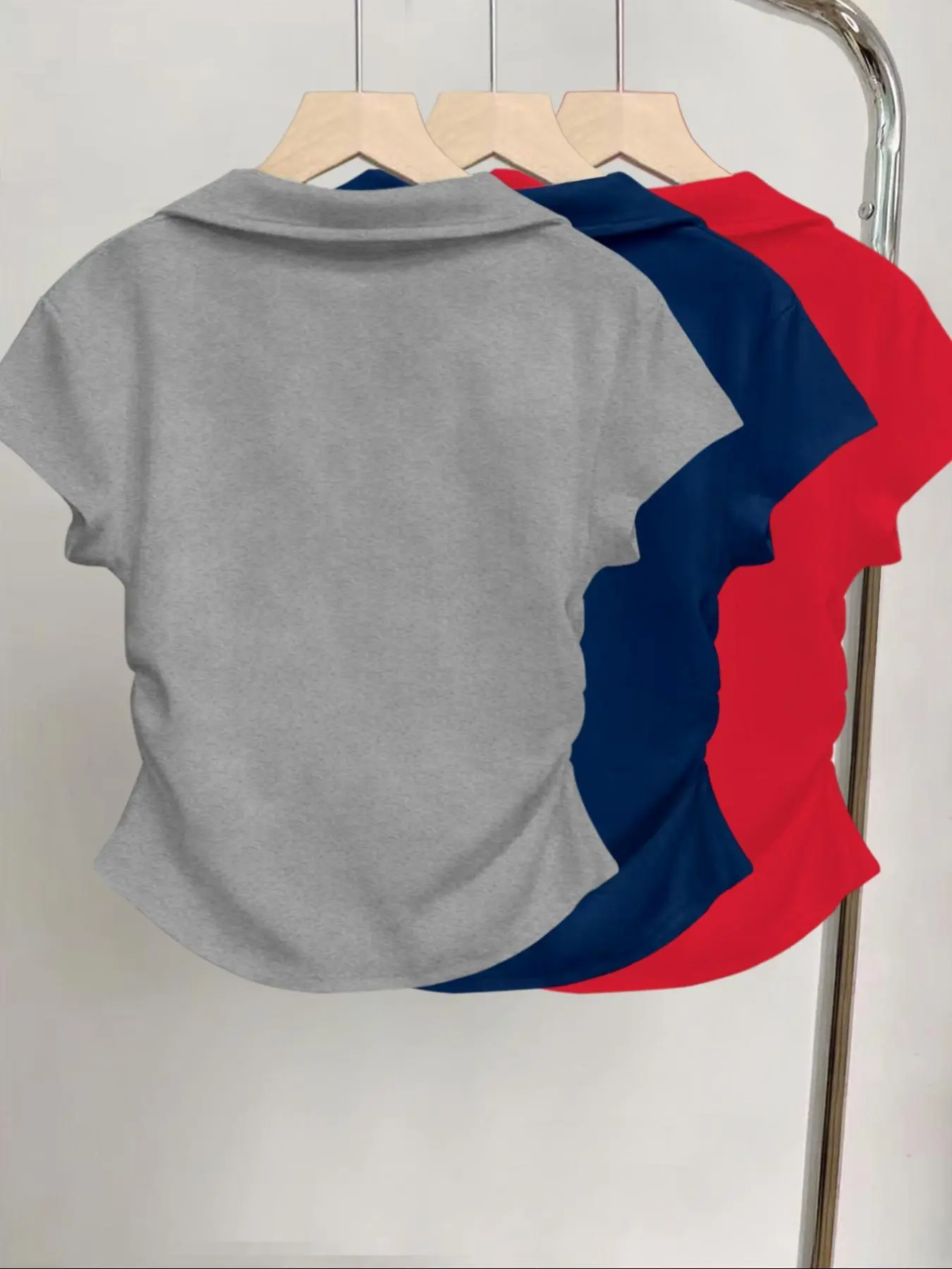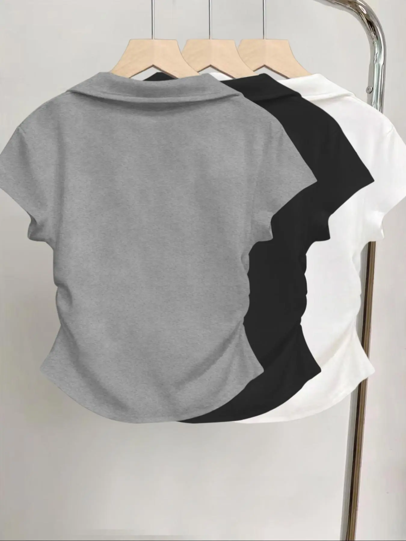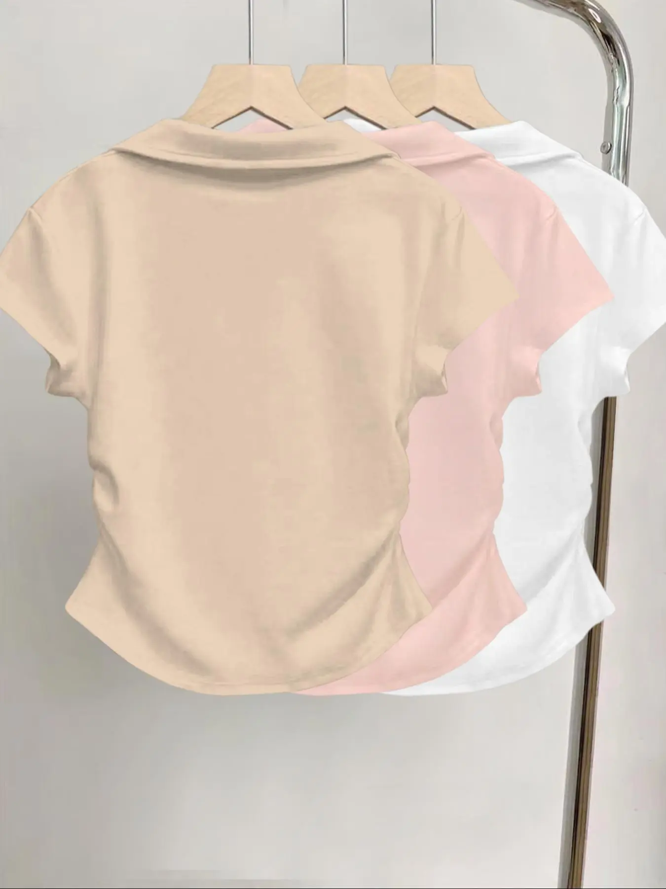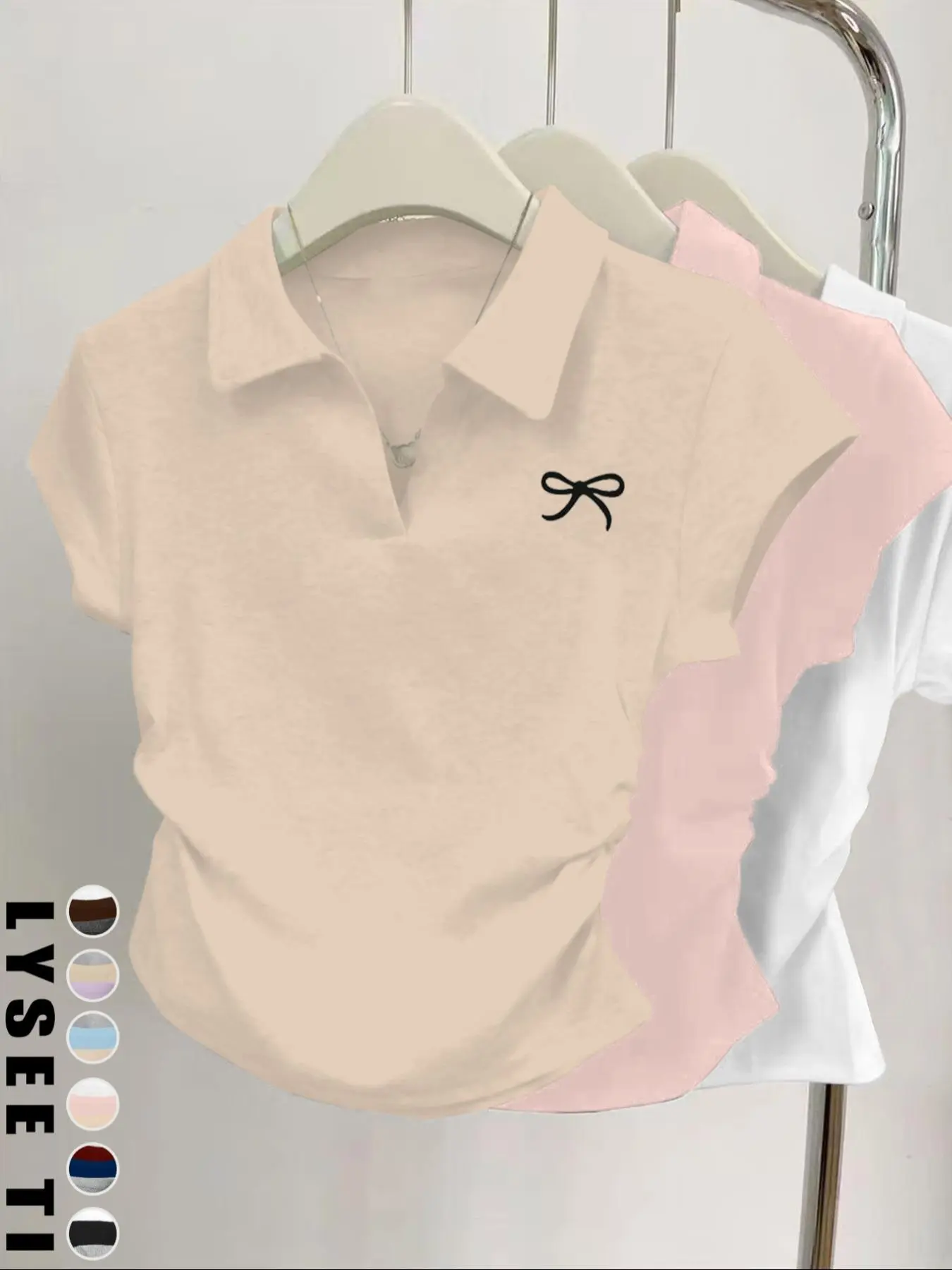 Preciosas camisetas estampadas de lazo y con cuello, mangas cortas, entalladas y fruncidas a los laterales, muy confortables para toda ocasión