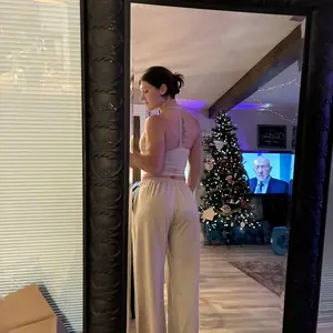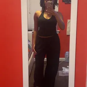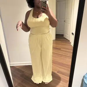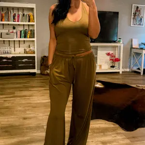 Sooooo super soft and comfy - top is unique and flattering. Can wear as a set or separate. Pads removable. Pants super straight leg - drawstring waist.