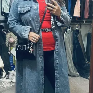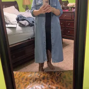 I’m 5”3 160lbs and ordered the large and it fits perfect! Can wear as a cardigan or a dress! Excellent material! 10/10 recommend! Denim is hard to find this good of quality! I approve!