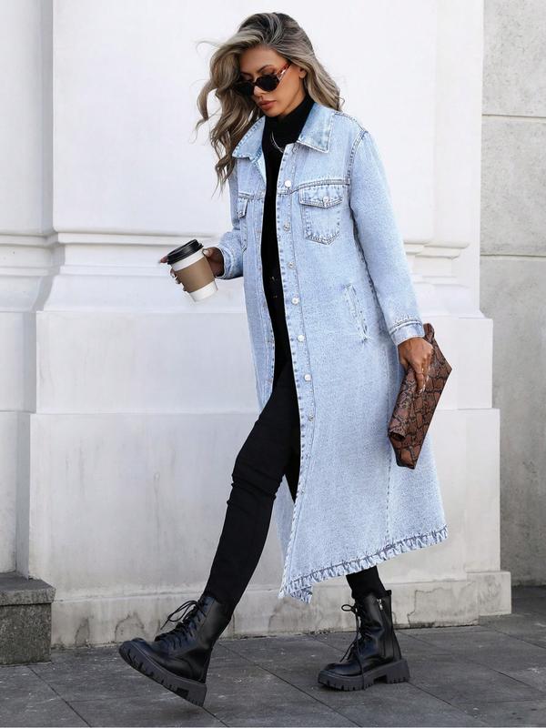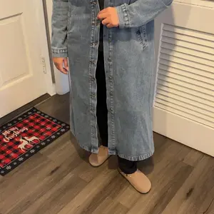 I love love my denim coat it fits just right I am 5/4 and 170LB it’s above my ankle I got a medium it fits perfectly it doesn’t have any stretch it has 2 pockets the material is very sturdy not flimsy