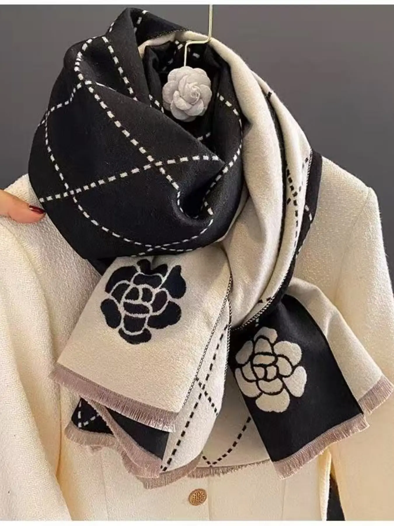 5. Women's High-End Light Luxury Camellia Imitation Cashmere Scarf, Fashion Evening Shawl, Elegant Soft Warm Winter Accessory, Floral Pattern Shawl