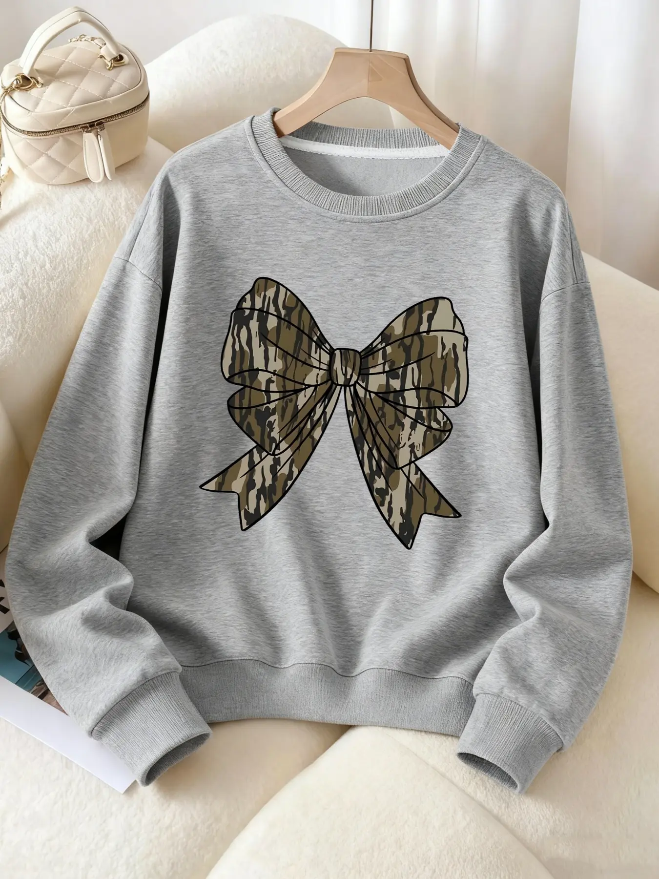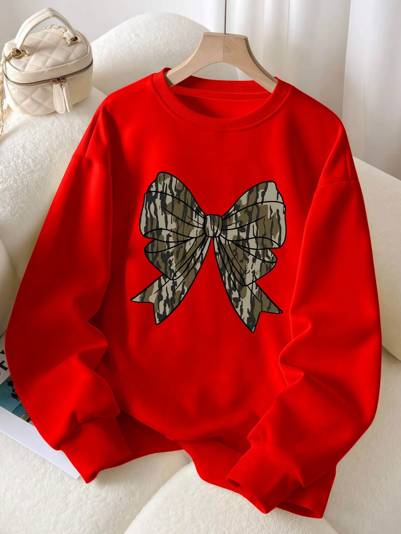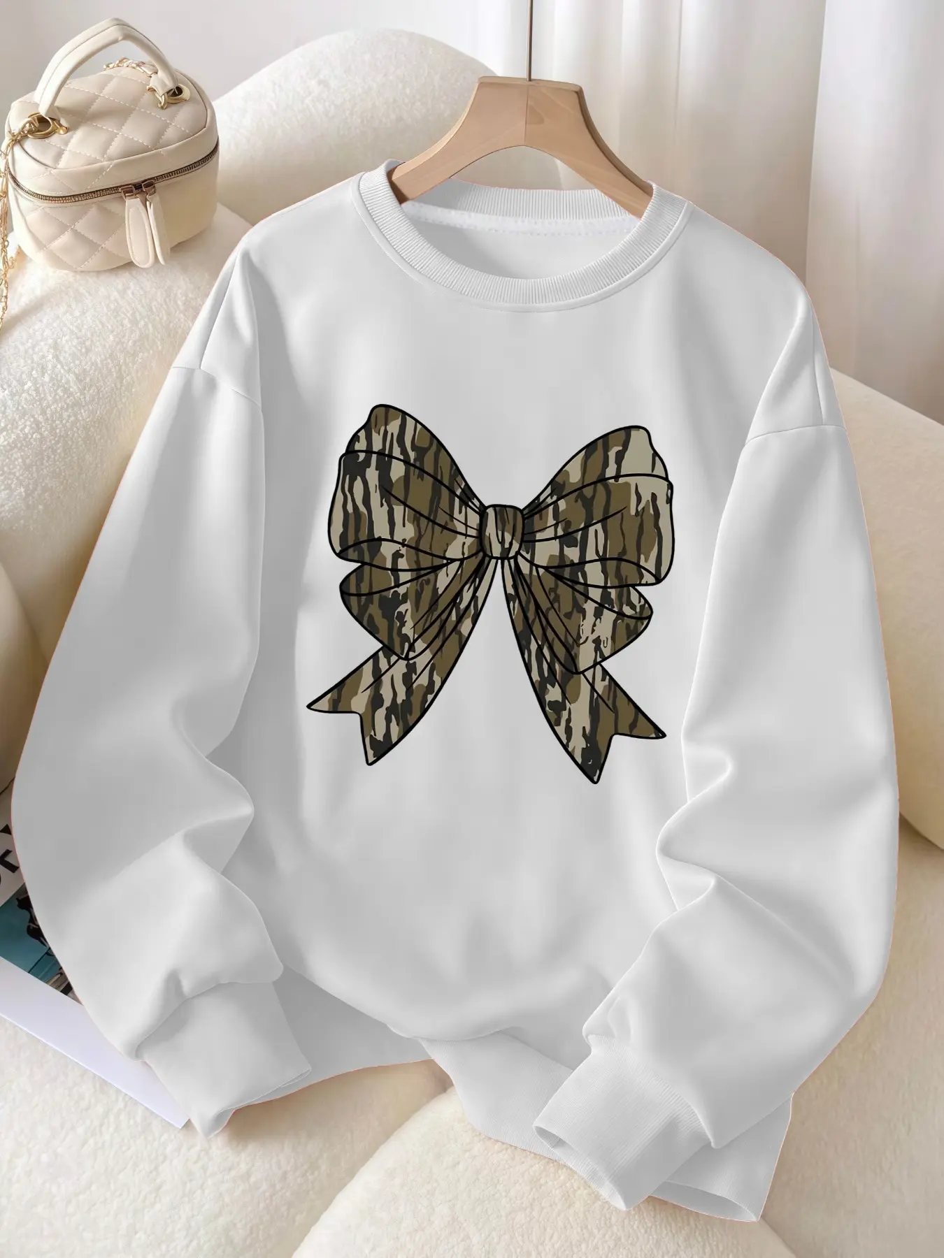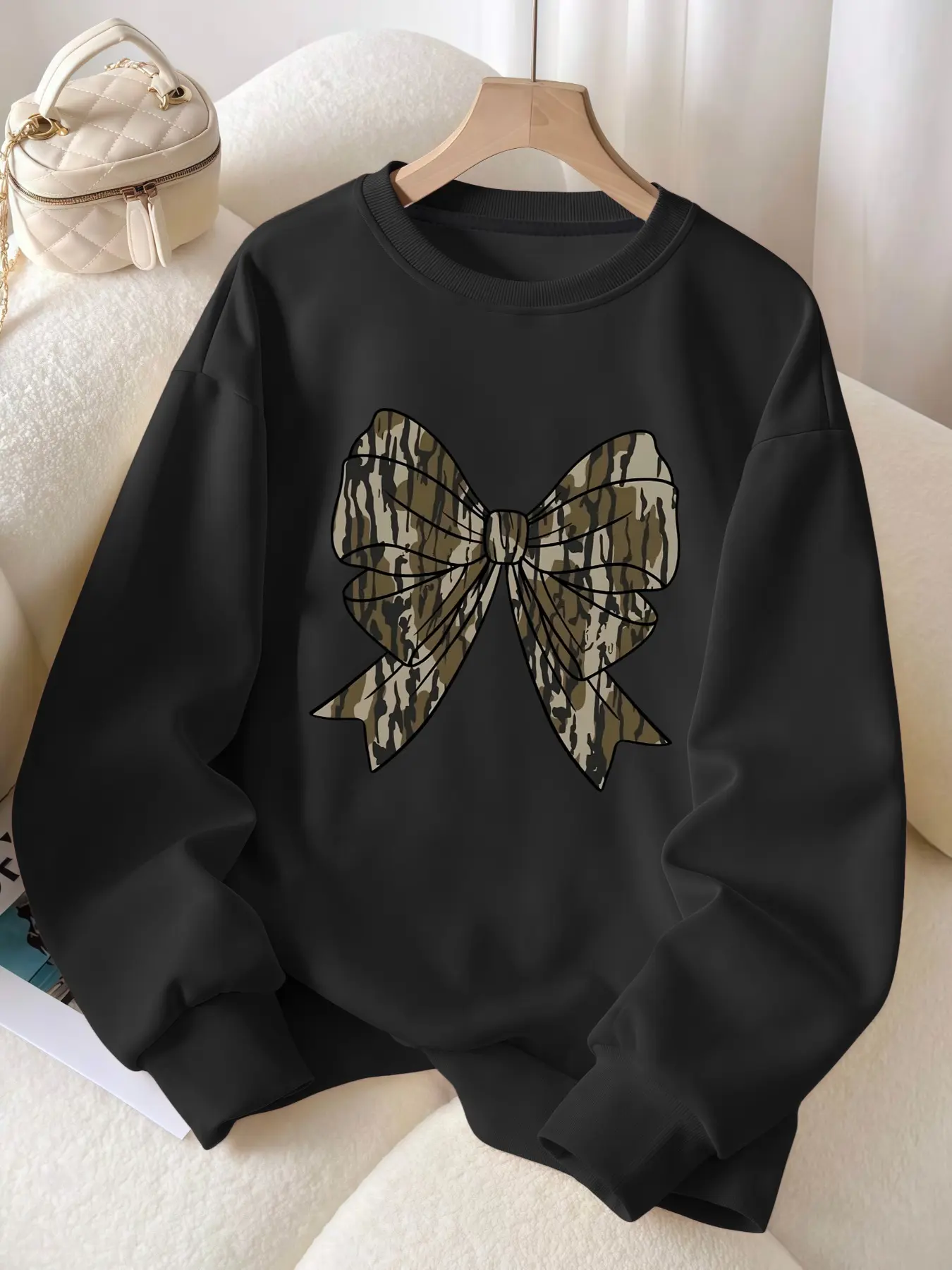 Women's Camo Bow Print Loose Fit Round Neck Sweatshirt, Fall & Winter Sporty Style, Casual Camouflage Pullover Top