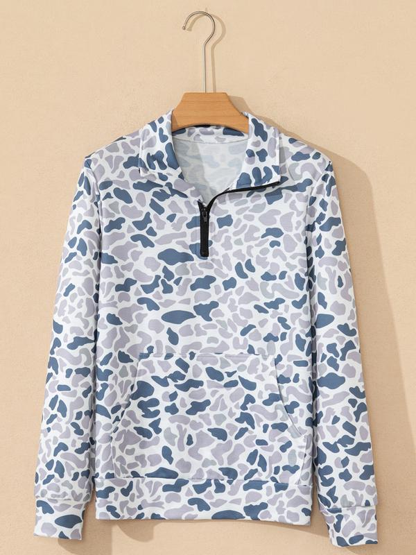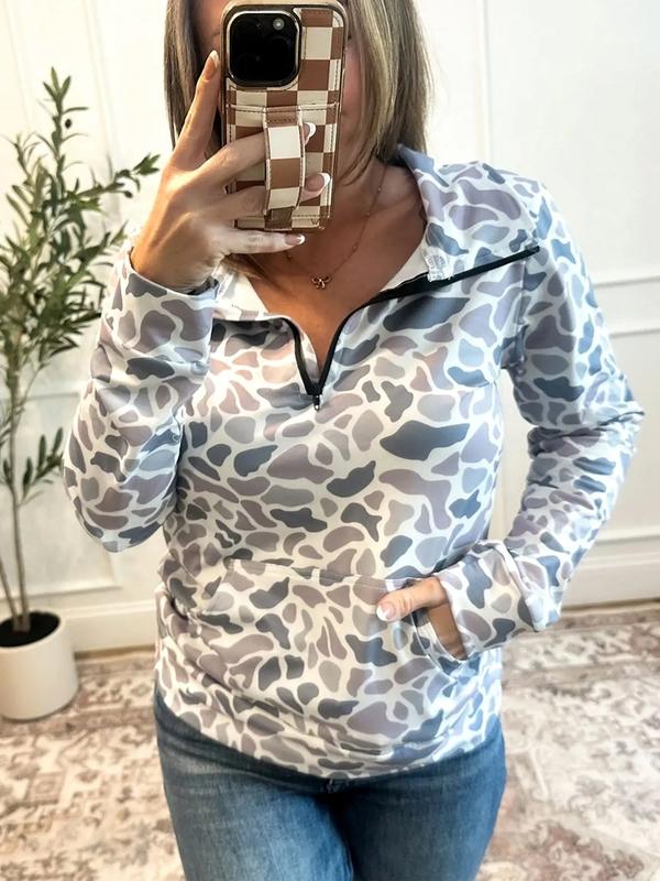 Women's Casual Camouflage Print Kangaroo Pocket Zip Collar Pullover Sweatshirt, Spring & Fall Fashion, Long Sleeve Pullover Sweatshirt