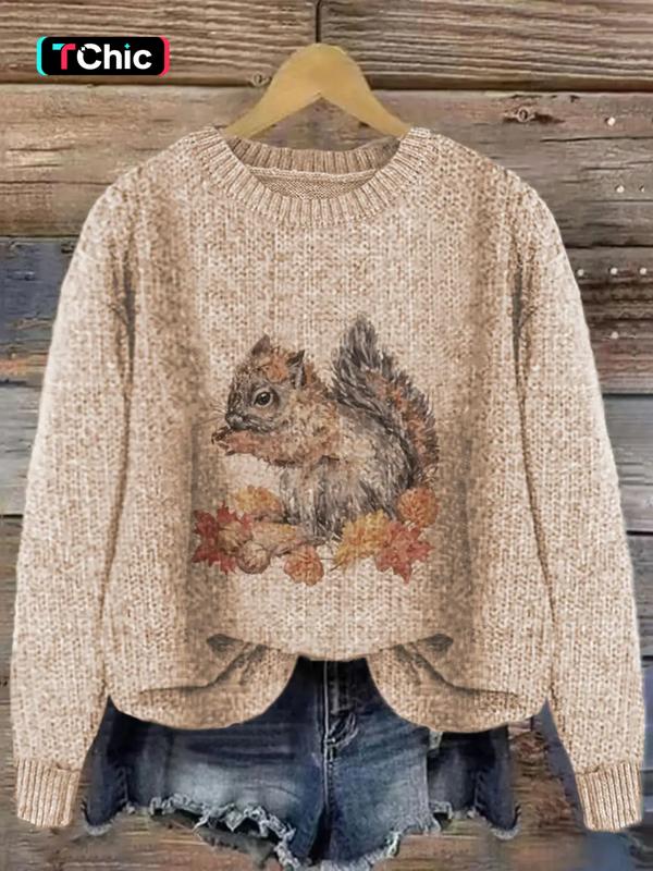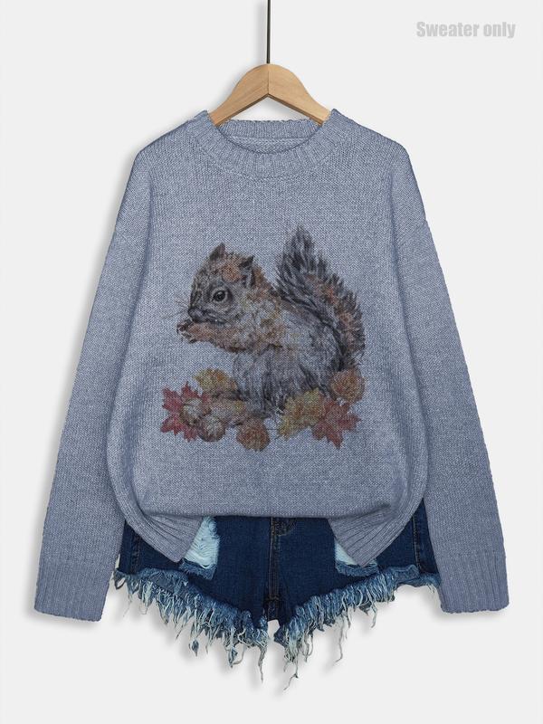 Women's Round Neck Cartoon Squirrel Print Sweater Knitwear, Loose-Fit Casual Knitted Pullover for Fall & Winter, Comfortable Daily Wear