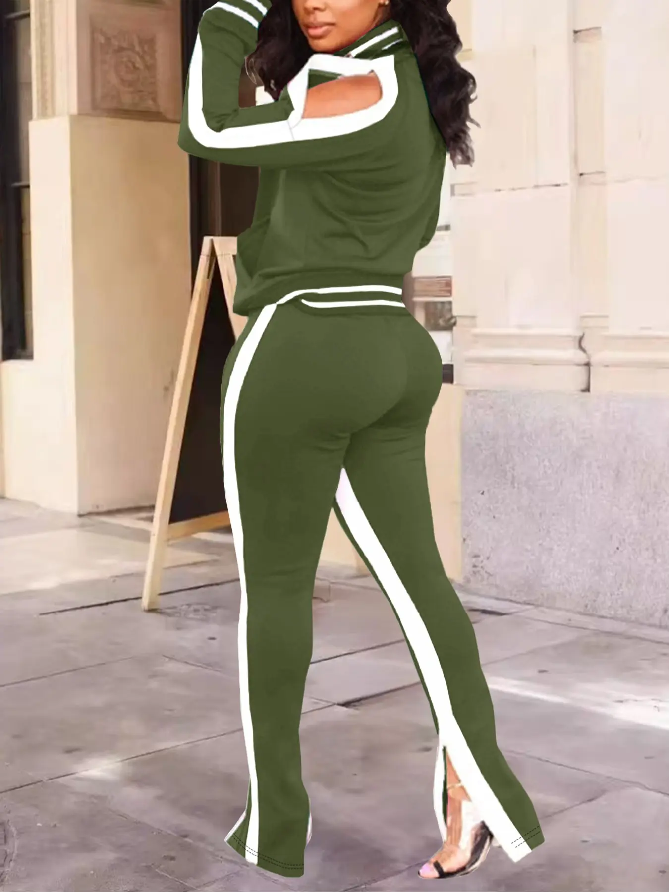 Love this two-piece the jacket is so sexy with the shoulder slit. You can dress it up or dress it down fits to size you can wear it sporty or wear it dressy great quality color is bold. I would buy this again.