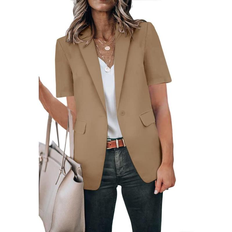 Basic lapel collar blazer jacket for women features two functional flap pockets. Front button, short sleeve, solid color, casual fit. Perfectly carrying some necessity, or nailing a chic look