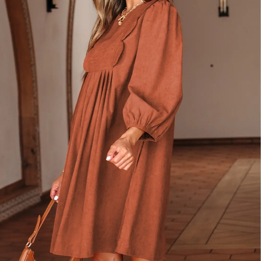 5. Asvivid Women's Casual Basic Bracelet Sleeve Split Neck Scallop Detail Pleated Corduroy Mini Dress for Spring Fall Fashion