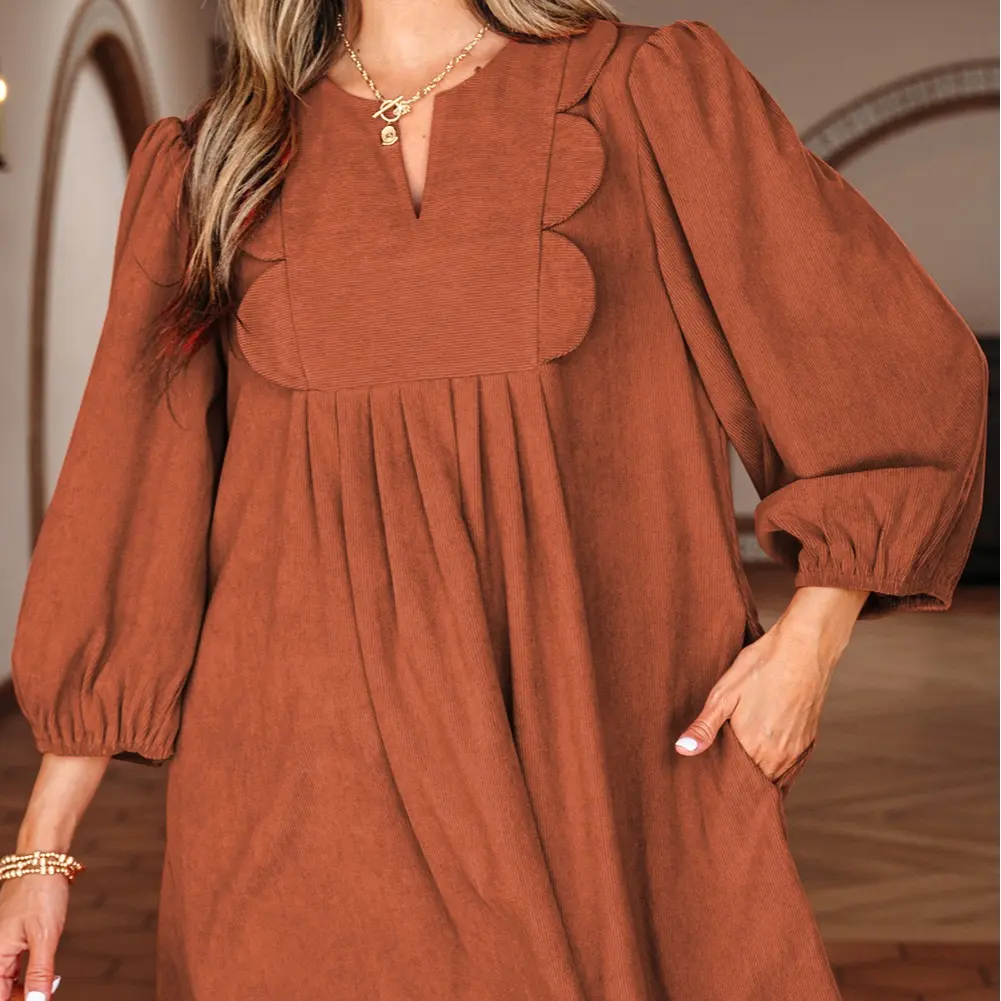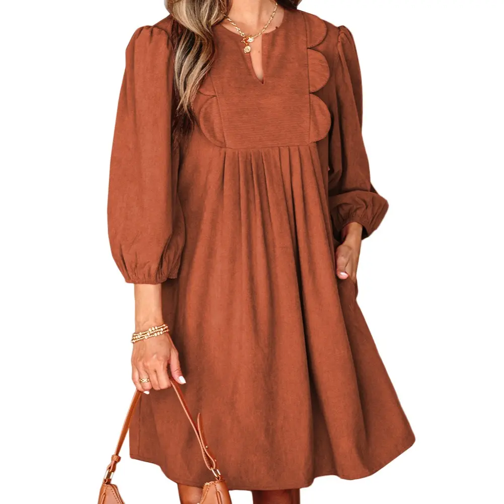 Asvivid Women's Casual Basic Bracelet Sleeve Split Neck Scallop Detail Pleated Corduroy Mini Dress for Spring Fall Fashion