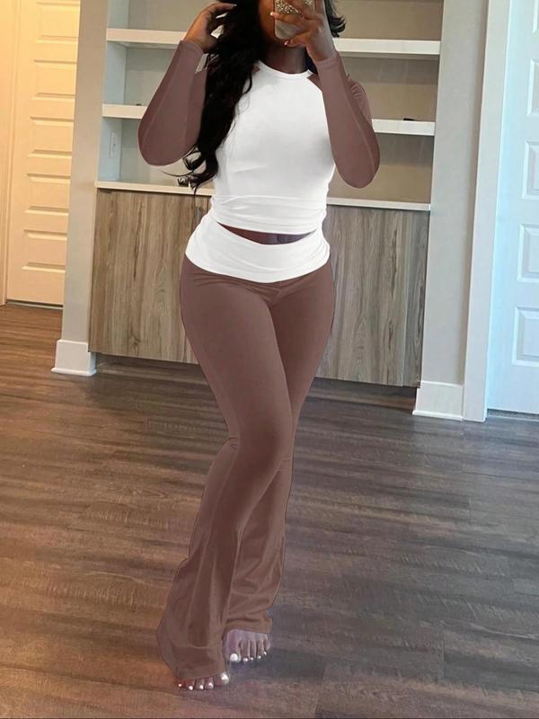 European and American Women's Casual Round Neck Long Sleeve Color Block T-Shirt with Ruffled Flare Pants Set, Perfect for Spring and Fall Wear