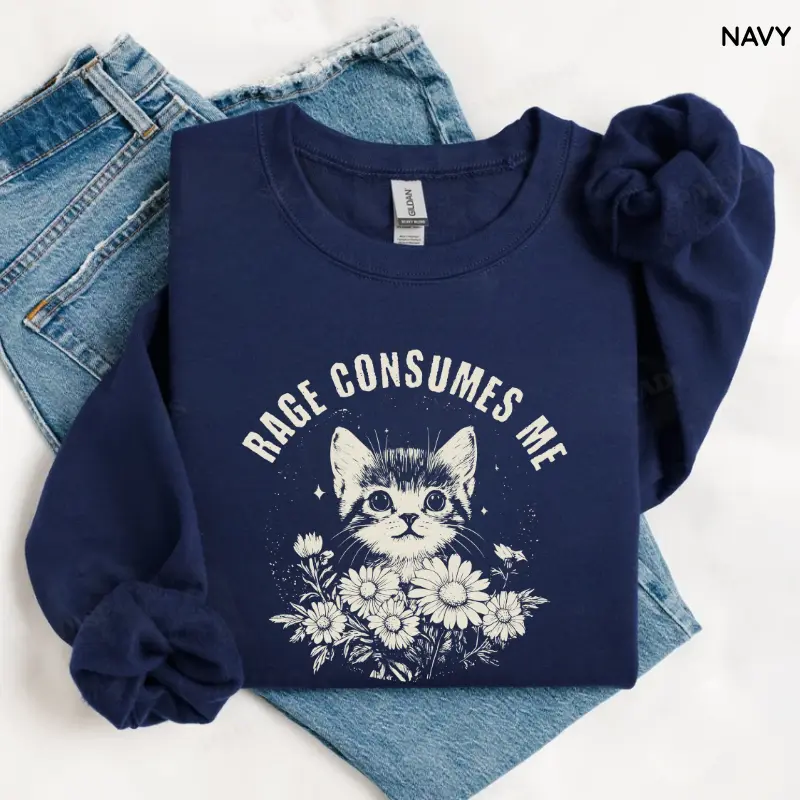 Rage Consumes Me Sweatshirt, Cute Cat Meme Pullover Crewneck Shirt, Trendy Shirts, Women Favorite Top