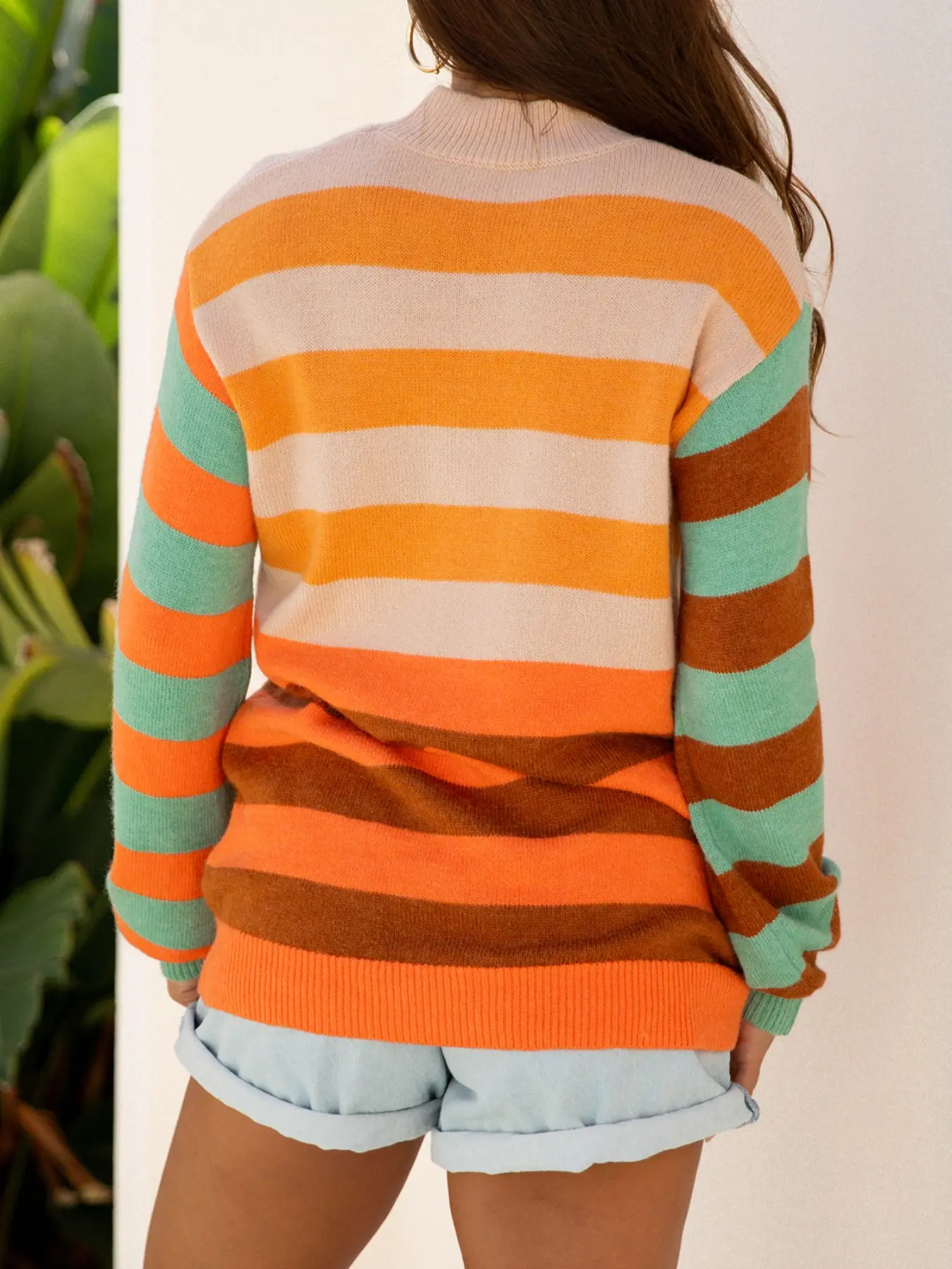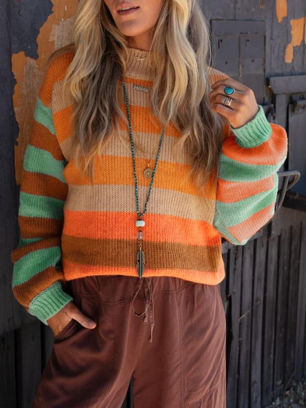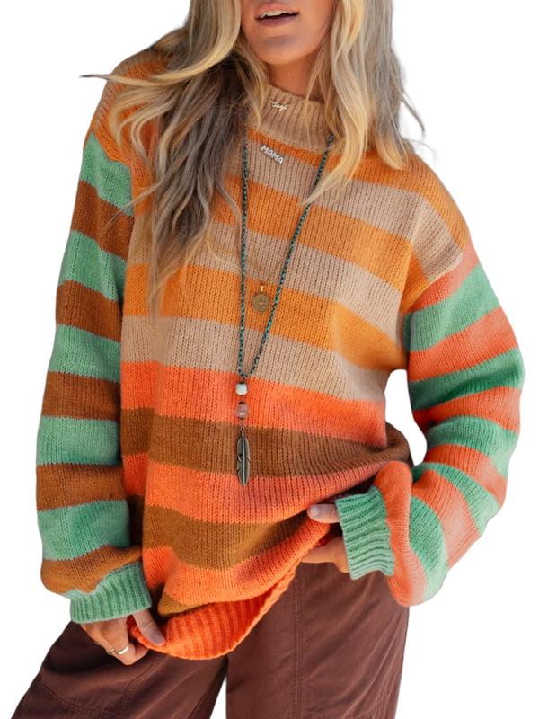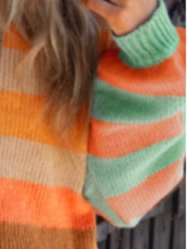 5. Women's Casual Elegant Colorblock Striped Print High Neck Drop Shoulder Comfortable Knit Mock Turtleneck Sweater for Autumn Winter