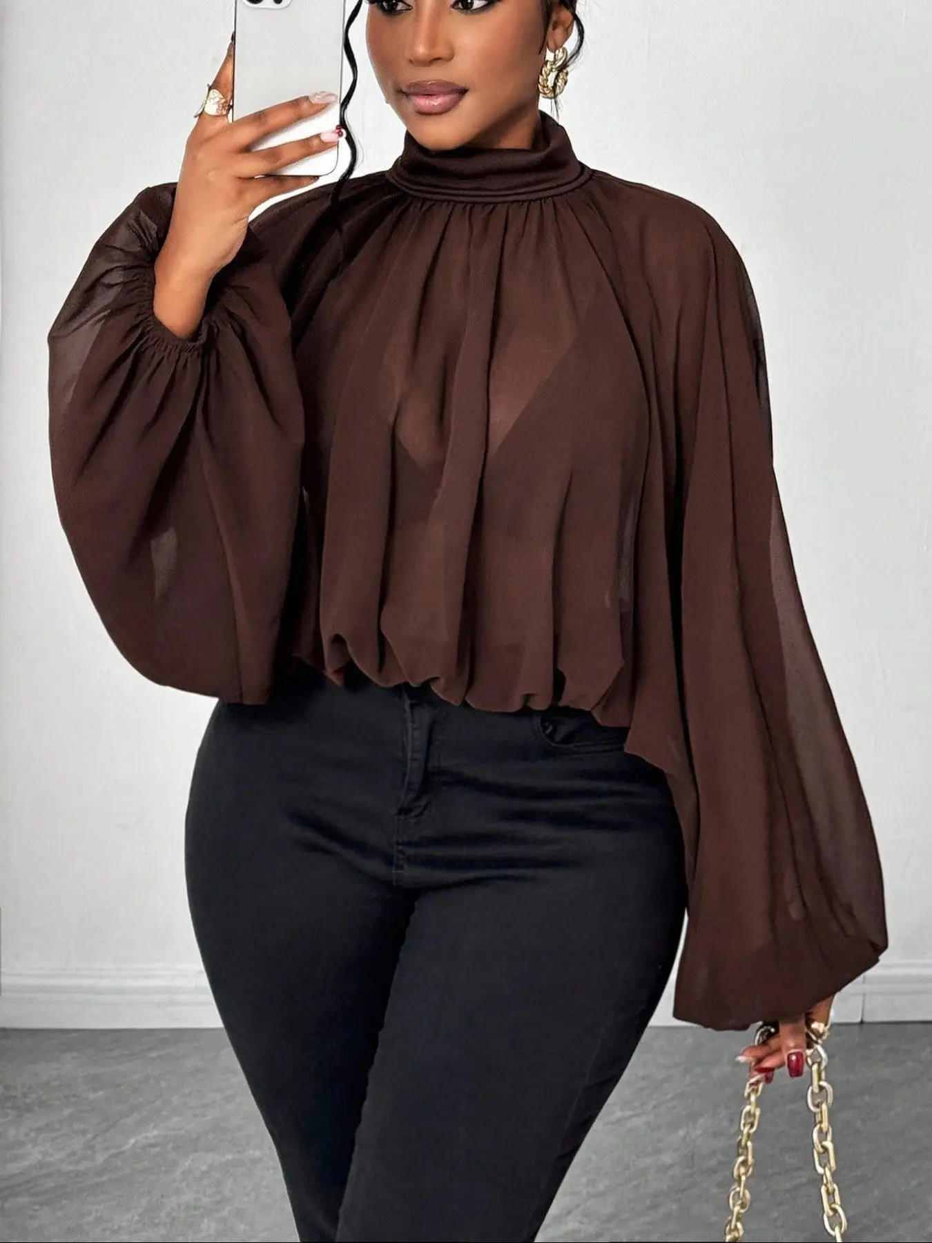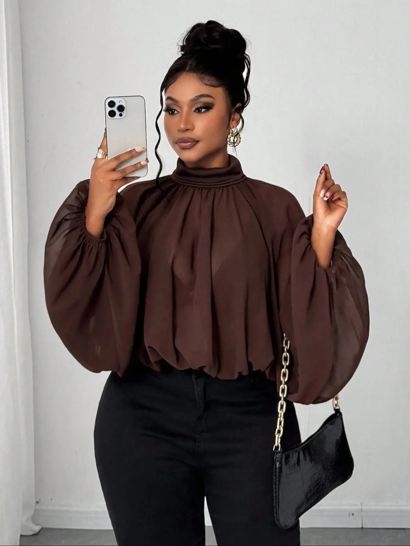 Women's Casual Fashion Top, Pure Color Stand Collar Lantern Sleeve Ruched Design, Spring & Fall Women's Clothing #springtops #falltops #blouses #ootdplussizeedition #fashionablewomensclothing #womansfashion #oversizetops #versatiletop #blousesfashion #springblouse