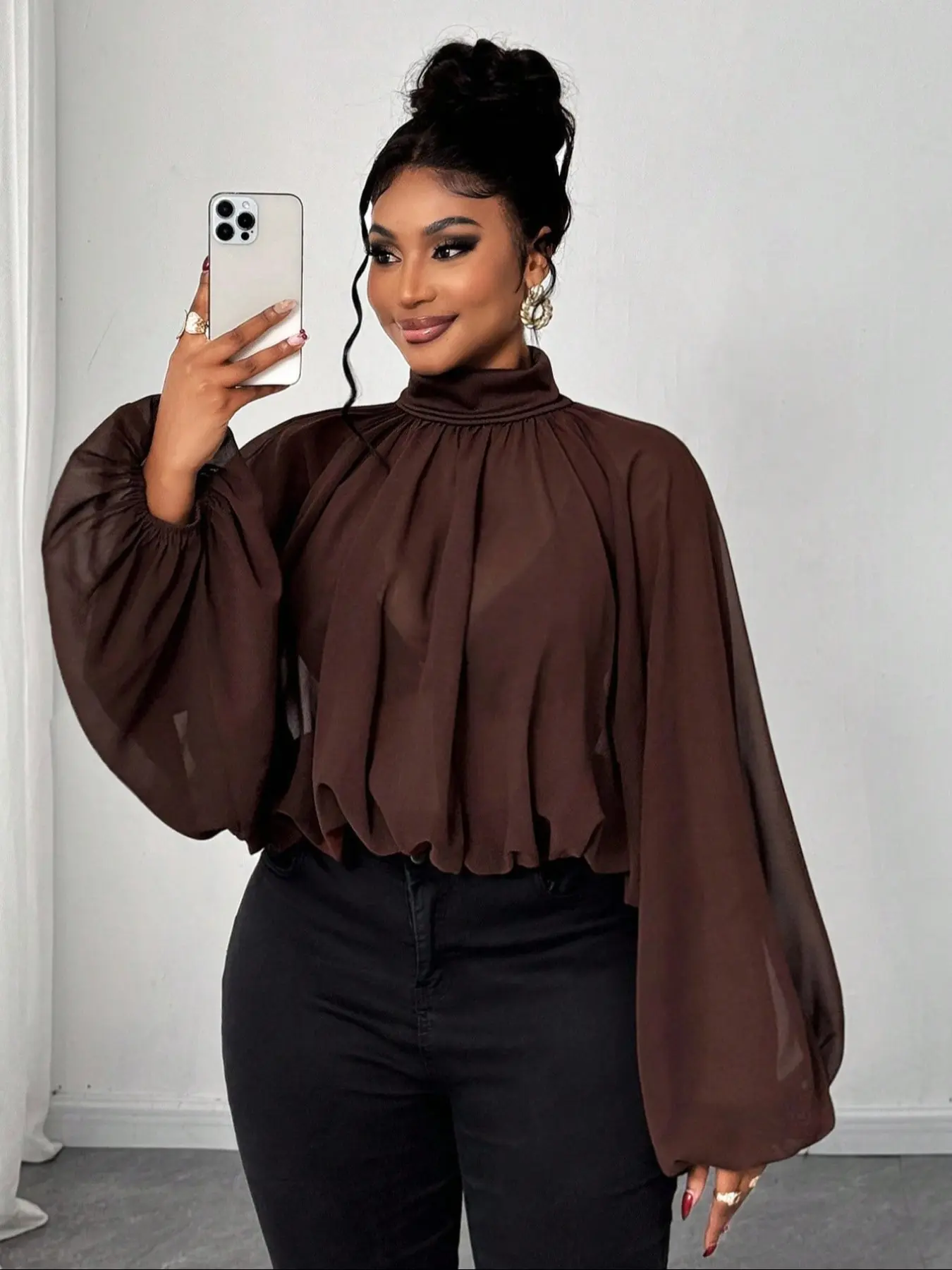 Women's Casual Fashion Top, Pure Color Stand Collar Lantern Sleeve Ruched Design, Spring & Fall Women's Clothing #plussizeoutfitideas #plussizevalentinesdayoutfits #plussizefashioninspo #plussizestyleinspo #plussizewinterfashion #blousesfashion #womenover40fashion #womensfashionreview #womensweargoals #springclothingataerie