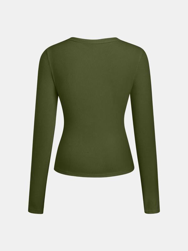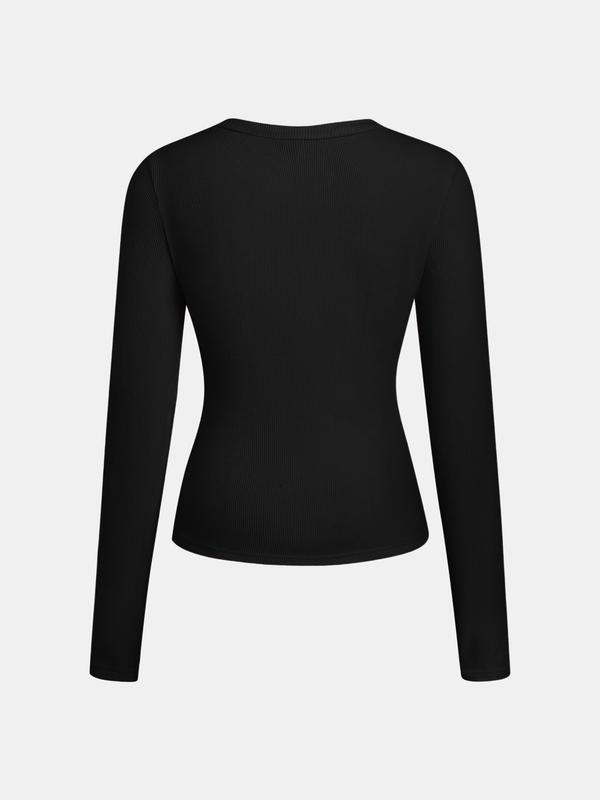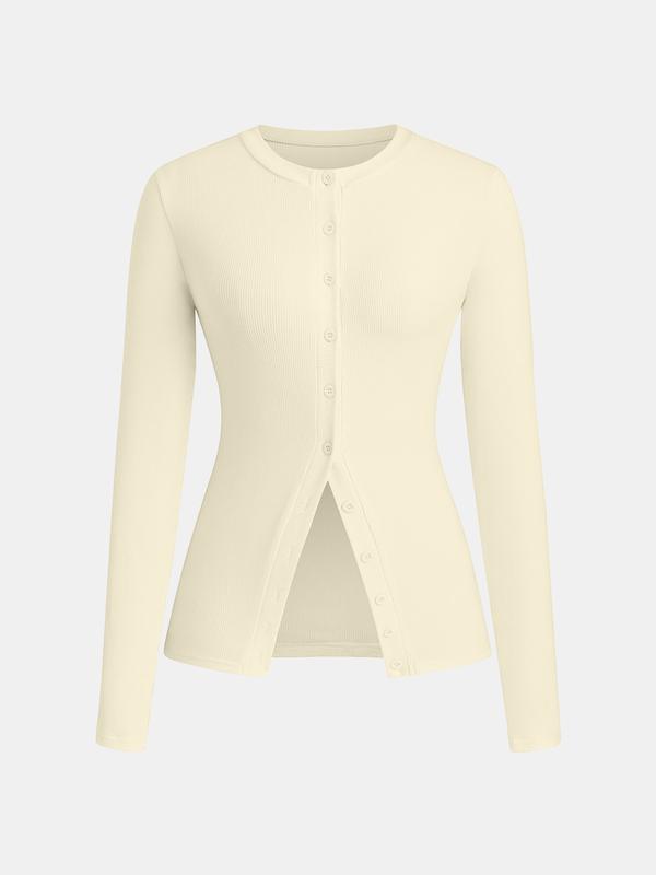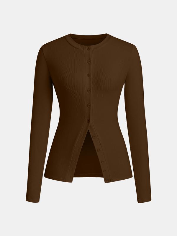 Women's Casual Round Neck Long Sleeve Button Front Top, Basic Solid Color Design, Extended Length, Perfect for Daily Wear, Womenswear