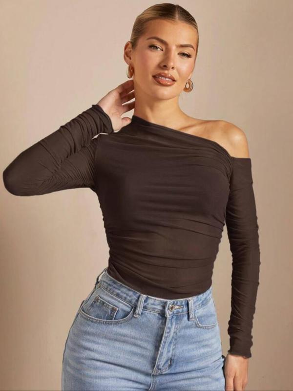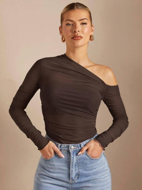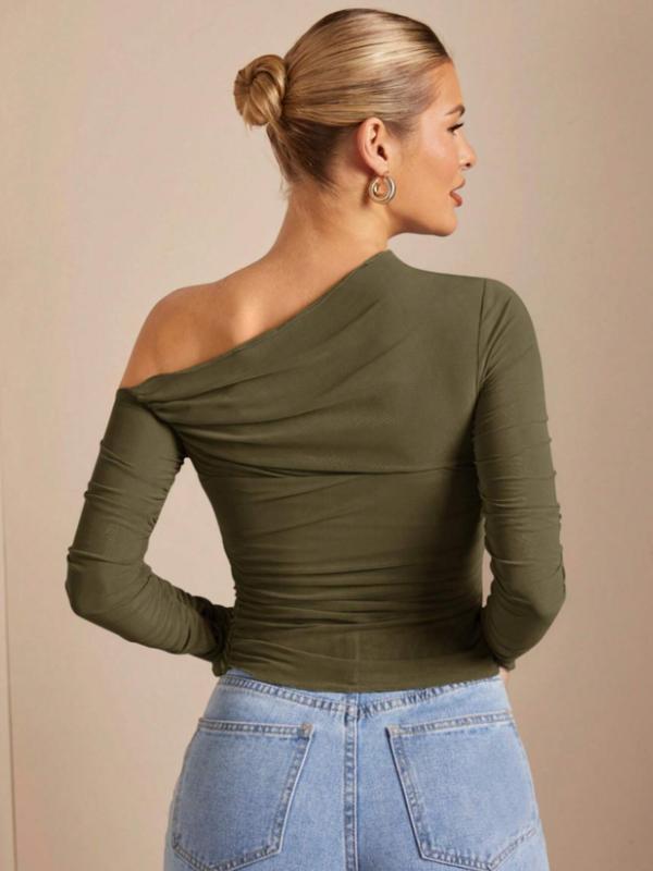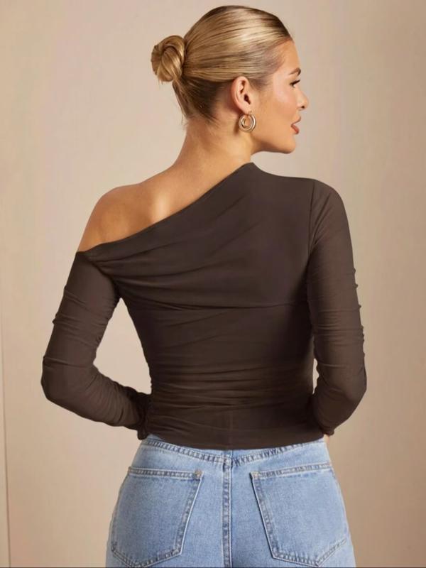 Women's Plain One Shoulder Tee, Trendy Casual Long Sleeve T-shirt for Daily Wear, Ladies Summer Outfit