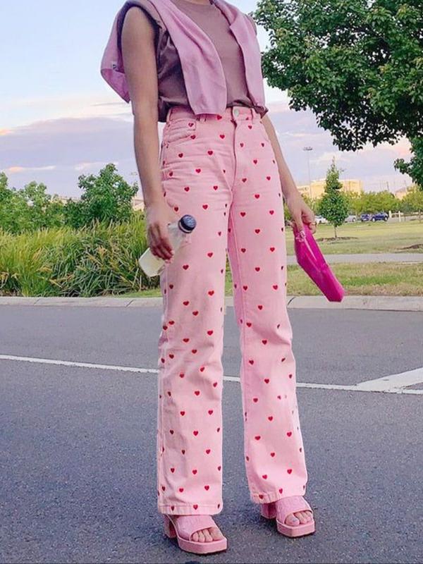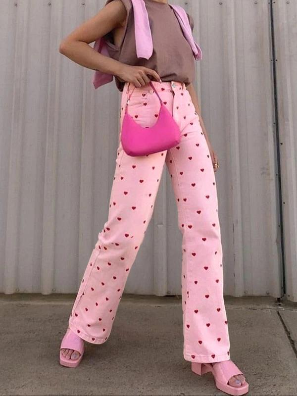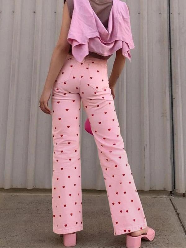 Women's Casual Loose-Fit Denim Wide Leg Pants, Stylish Boho Fashion Trousers for Daily Wear, Heart Print Washed Jeans for All Season Comfort #jeanshighwaist #pinkfashion #jeanswomens #denimrompers #bellbottomsjeans👖 #comfortablepantsforwomen #flarepantstrend #uniquejeans #bestpairofjeans #printedjeansforgirls