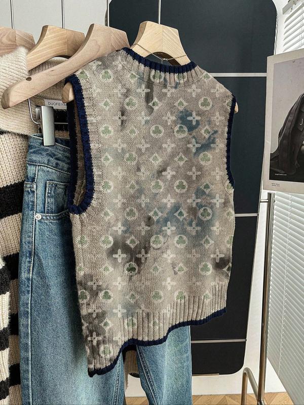 Women's Casual Loose-Fitting Round Neck Sleeveless Knit Top, Colorblock Deep Blue Edge Clover Print, Fall Winter