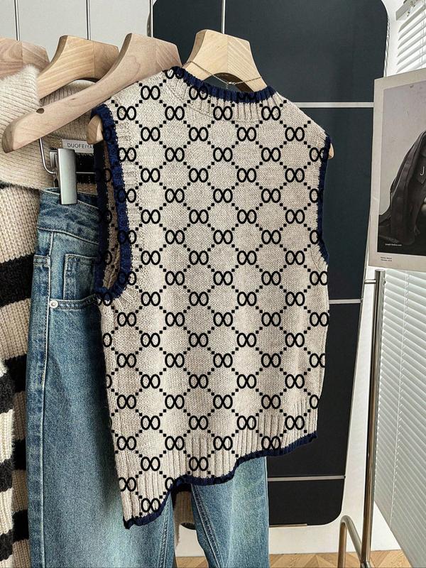 Women's Casual Loose-Fitting Round Neck Sleeveless Knit Top, Colorblock Deep Blue Edging Grid Print, Fall Winter Fashion #falltops #womensclothingtiktokshop #womenssweater #plussizeweightedvest #trendytops #womensapparel #versatilefashion #sweatershirt #vneckcardigan #weightedvestforwomen