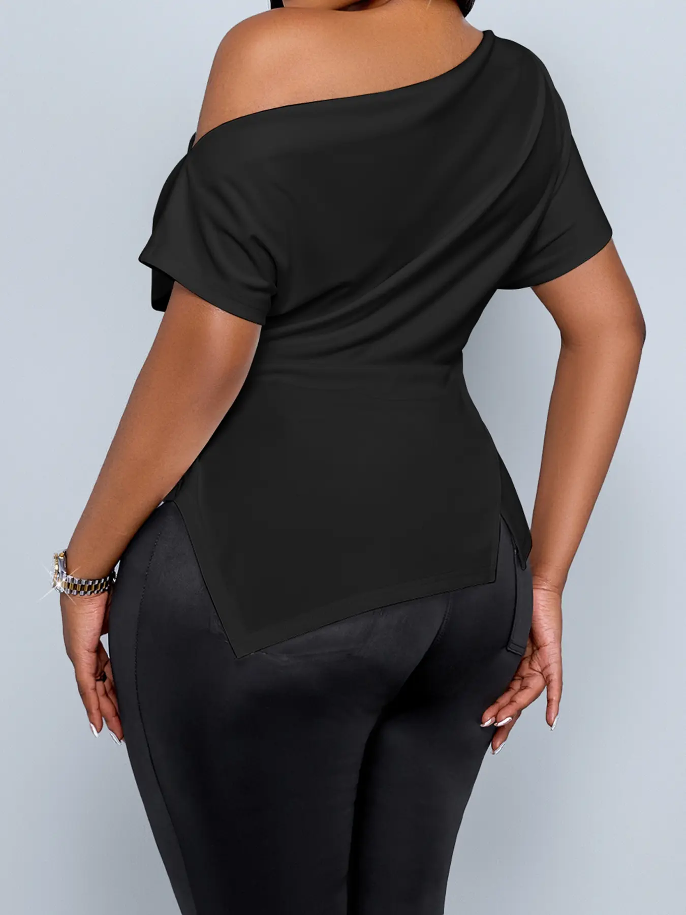 Plus Size Women's Casual Ombre Asymmetrical Hem Short Sleeve Top Blouse, Fitted Drop Shoulder Design, Perfect for Fall Season, Daily Wear &#ootd #fyp #womens #tiktokshop #comfortable