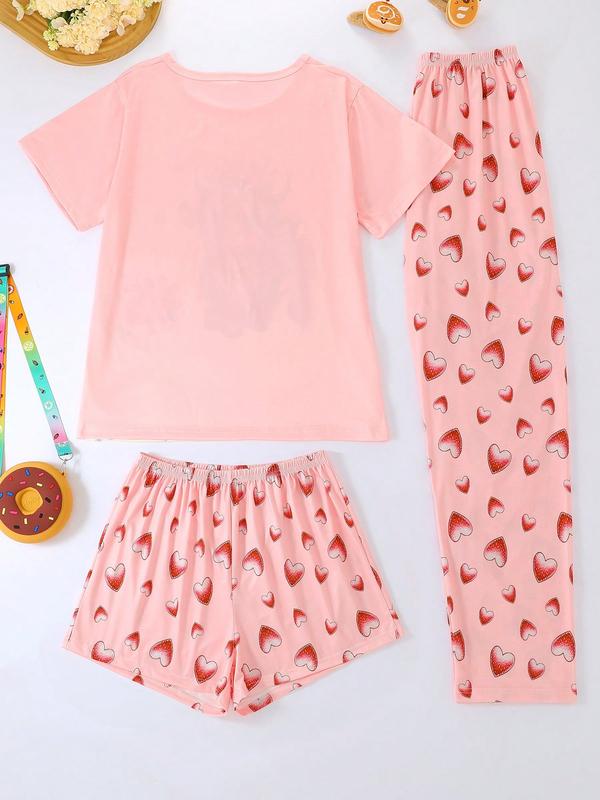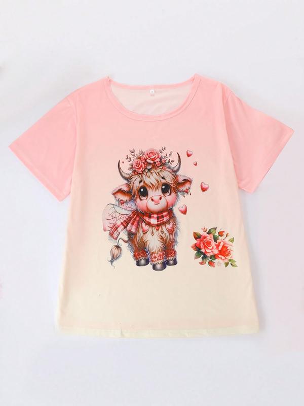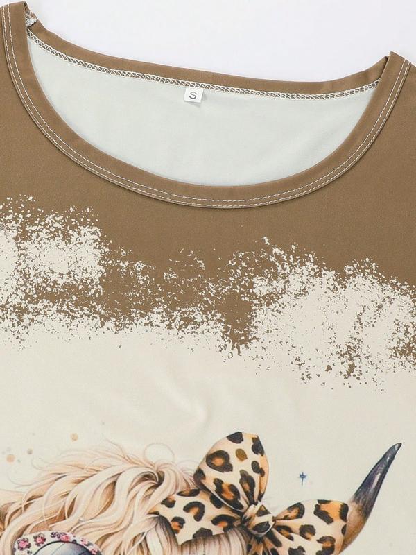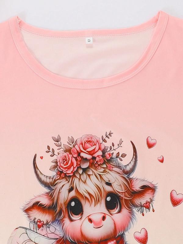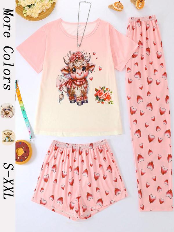 Women's Casual Pajama Set, Round Neck Short Sleeve Top & Elastic Shorts/pants, Leopard & Highland Cow Print, All-Season Wear