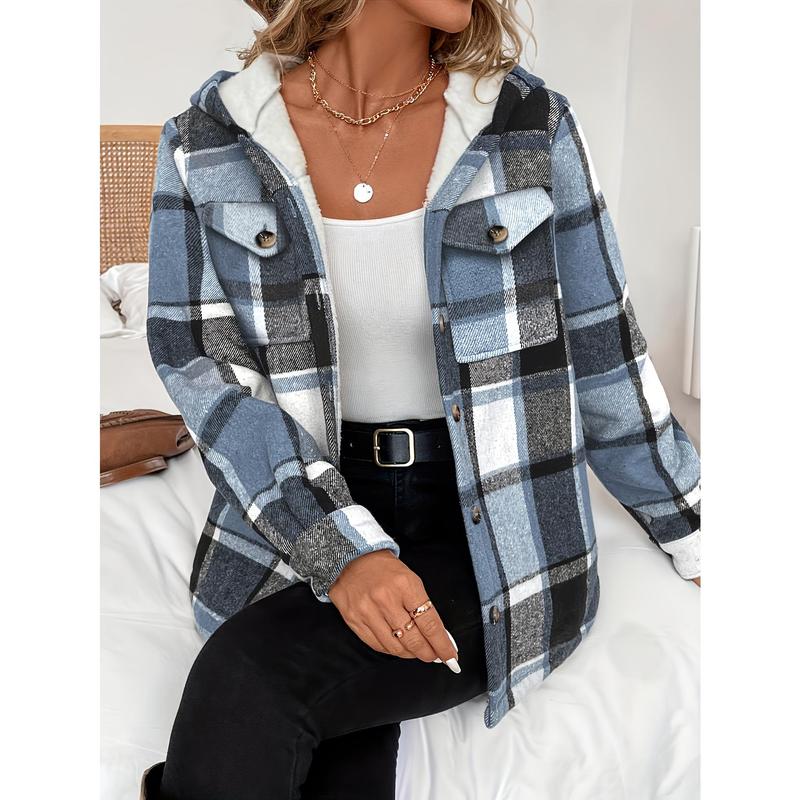 5. Women's Casual Plaid Hooded Jacket with Fleece Lining 100% Polyester Woven Shirt Button Detail All-Season Warmth Lightweight Outerwear Coats Fitted Khaki Long Sleeve Tops