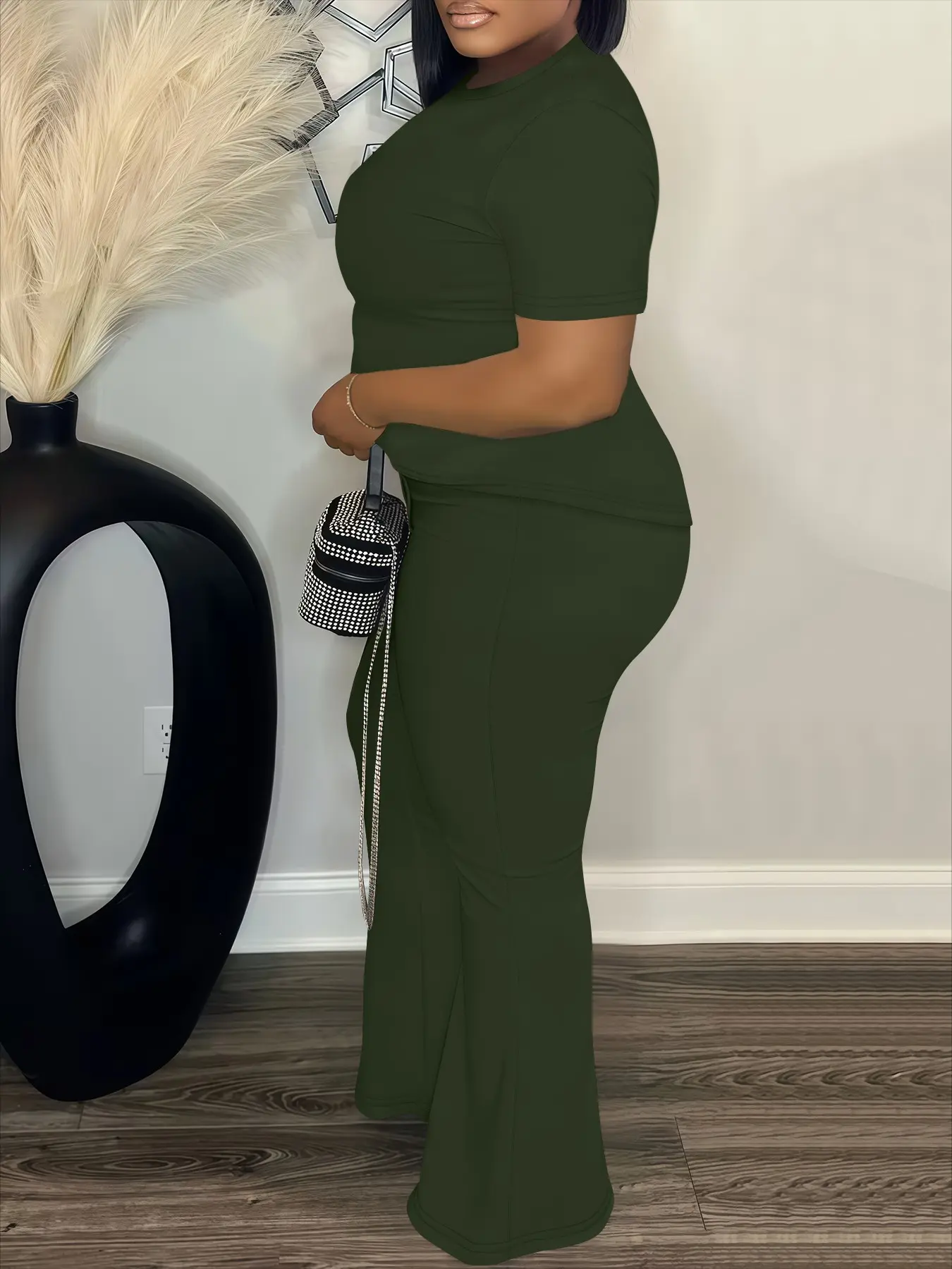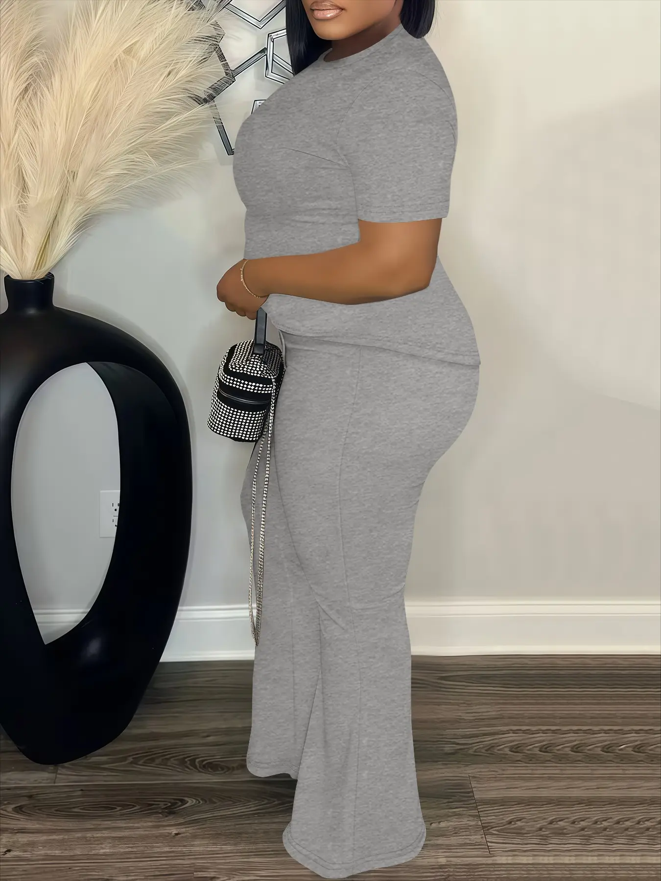 5. Women's Fashion Casual Short Sleeve Set, Plain Loose-Fitting High Waist Pants & Top, Spring & Fall, Plus Size