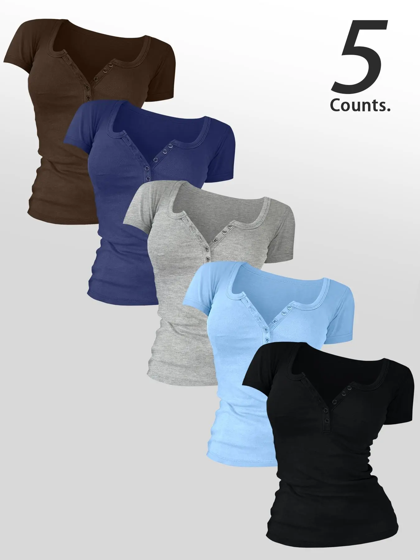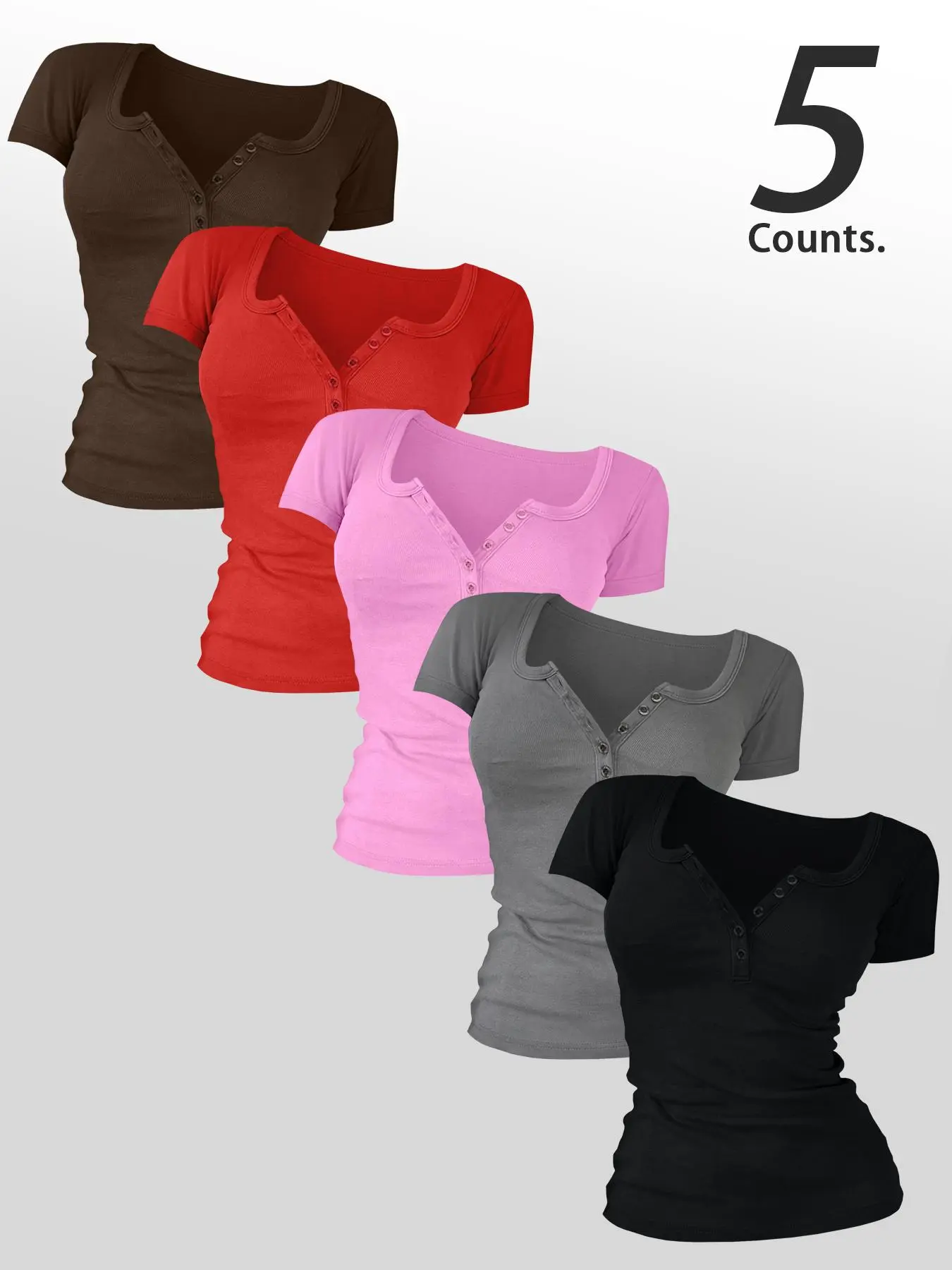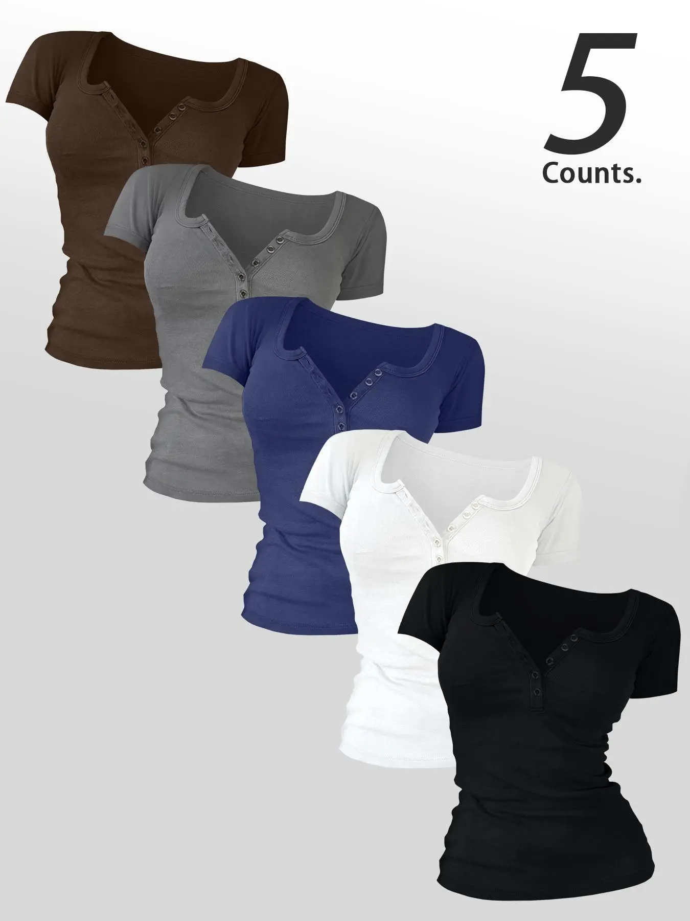 5. Women's Solid Color Button Decor Tee, Casual Short Sleeve Round Neck Basic T-shirt for Summer, Ladies Clothes for Daily Wear, Top